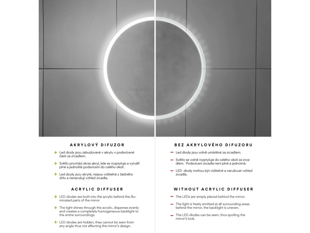 LED diody jsou vkusně integrovány do rámu spolu s difuzorem, což přispívá k elegantnímu a čistému vzhledu zrcadla. Zrcadlo využívá nejmodernější LED čipy SMD 2835, které jsou známé svou vysokou svítivostí, energetickou úsporností a dlouhou životností.