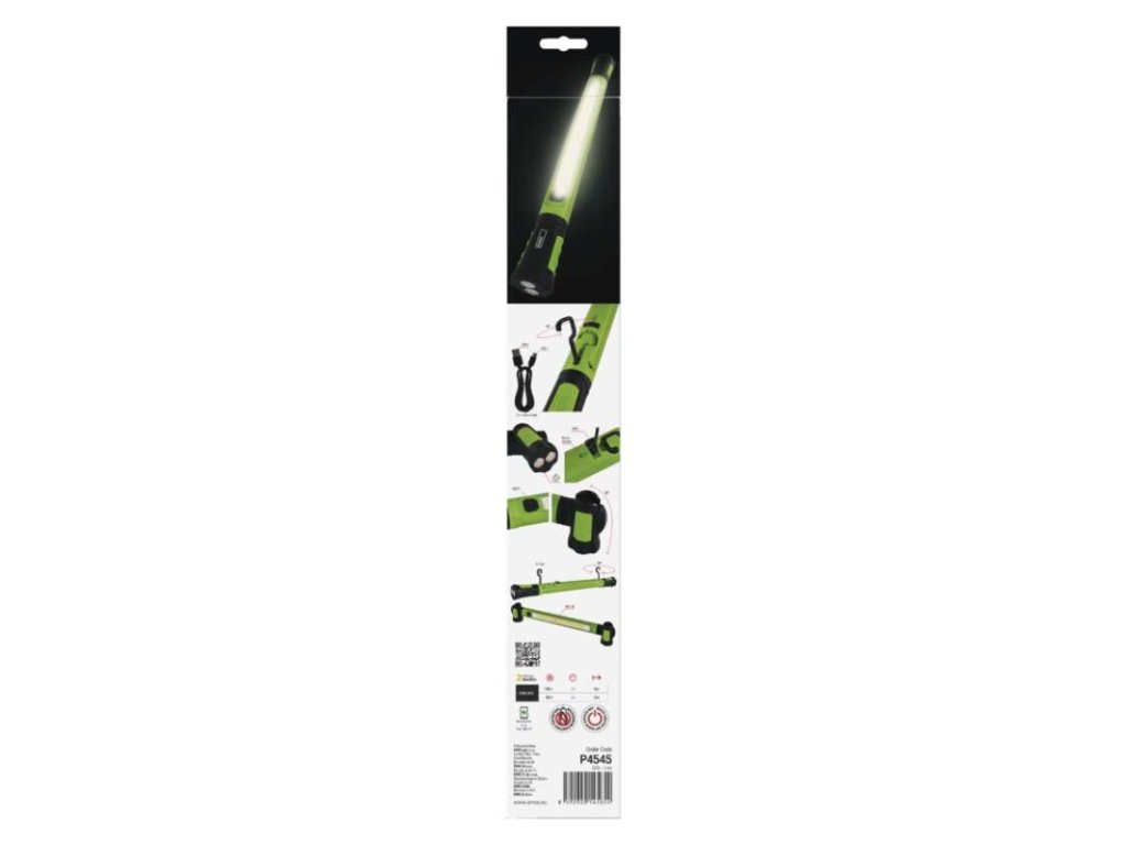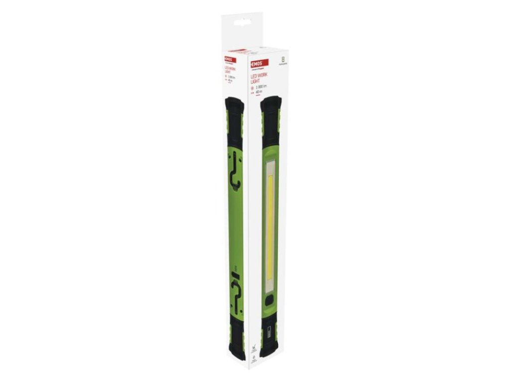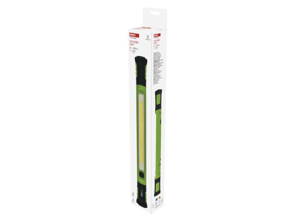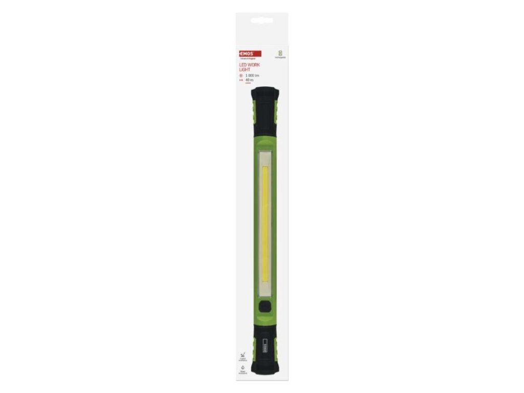 barva: zeleno-černá|baterie součástí balení: ano|doba nabíjení: 5 h|doba svícení: 2–6 h|doba svícení detail: COB LED 100 % – 2 h, COB LED 40 % – 6 h|dosvit: COB LED 100 % – 40 m, COB LED 40 % – 25 m|fokus: ne|hmotnost: 490 g|LED indikace nabíjení: ano|LED indikace stavu akumulátoru: ano|materiál: ABS plast|maximální dosvit: 40 m|maximální světelný tok: 1 000 lm|nabíjecí: ano|napájení: Li-Ion|nárazuvzdornost: ano|počet režimů svícení: 2|příslušenství: USB kabel|prodejní obal: 1 ks, papírová krabička|režimy svícení: COB LED 100 %, COB LED 40 %|rozměr: 50 × 46 × 500 mm|speciální funkce: funkce rychlého vypnutí, funkce ochrany baterie|světelný tok: COB LED 100 % – 1 000 lm, COB LED 40 % – 400 lm|typ baterie: 2 600 mAh/7,4 V|typ napájecího konektoru: USB-C|voděodolnost: ano (IP43)|vybavení: 2× otočná rukojeť, 2× hák, 4× magnet|záruční doba: 2 roky|zdroj světla: COB LED|značka: EMOS
