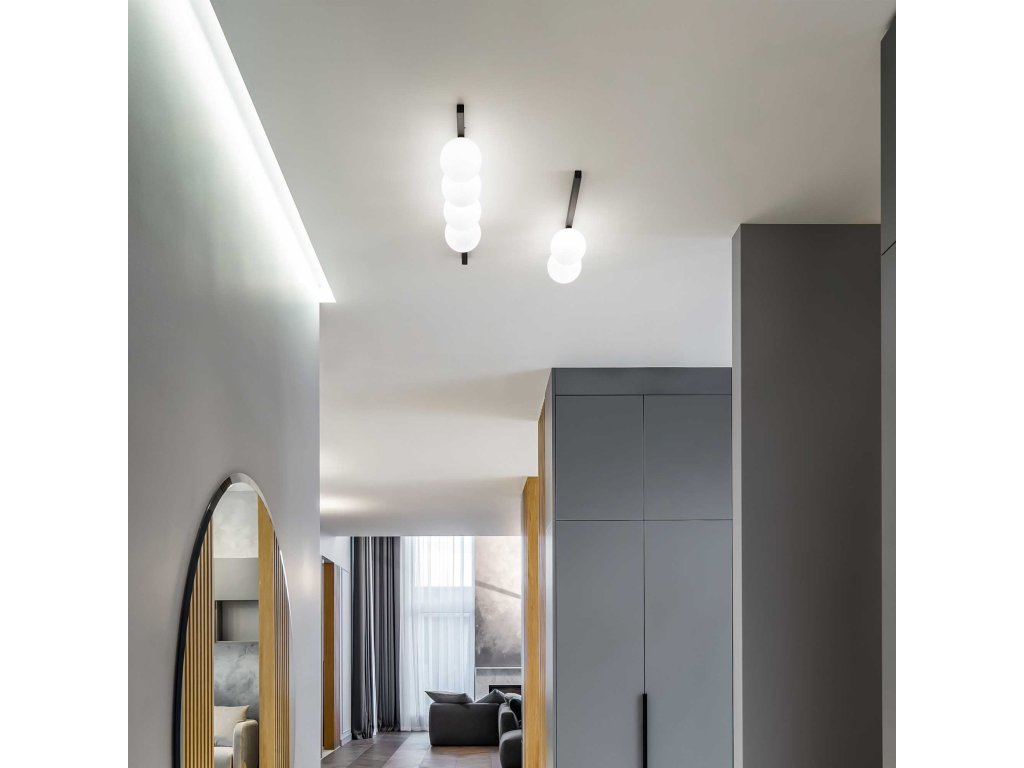 Kovový rám. Difuzory z bílého foukaného skla leptaného kyselinou se šroubovým upevněním. Povrchová úprava: bílá, černá, kartáčovaná mosaz.