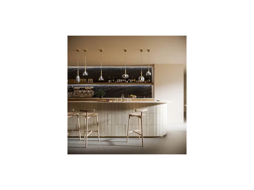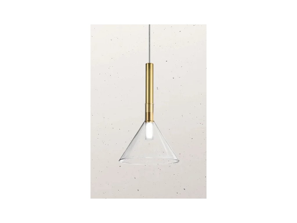 Přírodní mosazný válcový prvek v kombinaci se skleněnými difuzory různých tvarů dává vzniknout jemné a elegantní kolekci. Závěsná svítidla lze uspořádat tak, aby byl každý kontext jedinečný a výjimečný, a to díky alchymii proporcí, kombinací, velikostí, tvarů a materiálů.