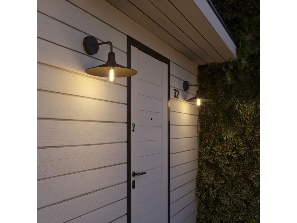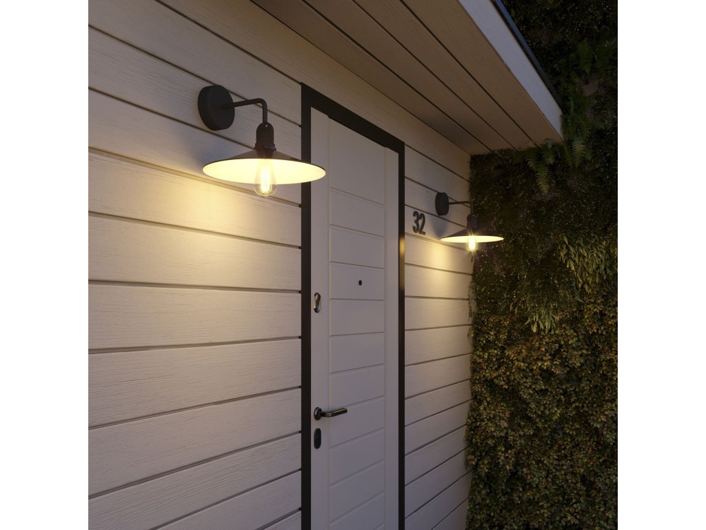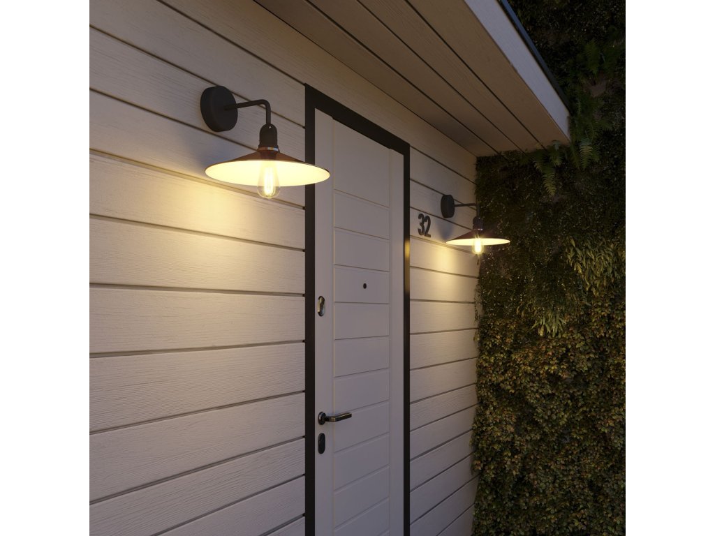 Fermaluce Eiva se smaltovaným kovovým stínidlem Swing je ideální venkovní nástěnná lampa pro milovníky městského elegantního stylu. Díky svému tvaru stínidlo Swing rozptyluje světlo po celé místnosti a odhaluje objímku EIVA - první objímku pro žárovky s krytím IP65 na světě, která je schopná zcela bezpečně odolávat dešti a bouřím. Díky krytí IP65 a kvalitě italských produktů bude tato nástěnná lampa perfektní pro bezpečné vyzdobení vašich venkovních prostor, jako je zahrada nebo terasa, aniž byste se museli obávat deště a bouří. Vyberte povrchovou úpravu komponent, která nejlépe odpovídá paletě interiéru, který zdobíte.
