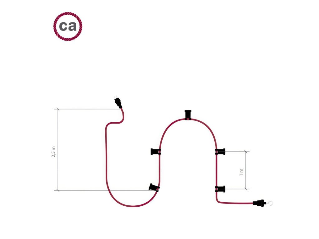 Systém Lumet je úžasný způsob, jak rozjasnit zahradu nebo altán. Nádherně vynikne i v interiéru u slavnostního setkání. S nádhernými barvami textilních kabelů objevíte vše, co potřebujete, abyste na Vaší společenské události snadno vytvořili příjemnou atmosféru. Hotový světelný řetěz je poskládaný ze Schuko zástrčky, háčku a 5 kusů bílých objímek E27. Háček Vám umožní připevnit svítidlo kam potřebujete, může být veden křížem přes místnost nebo naopak podél místnosti.
