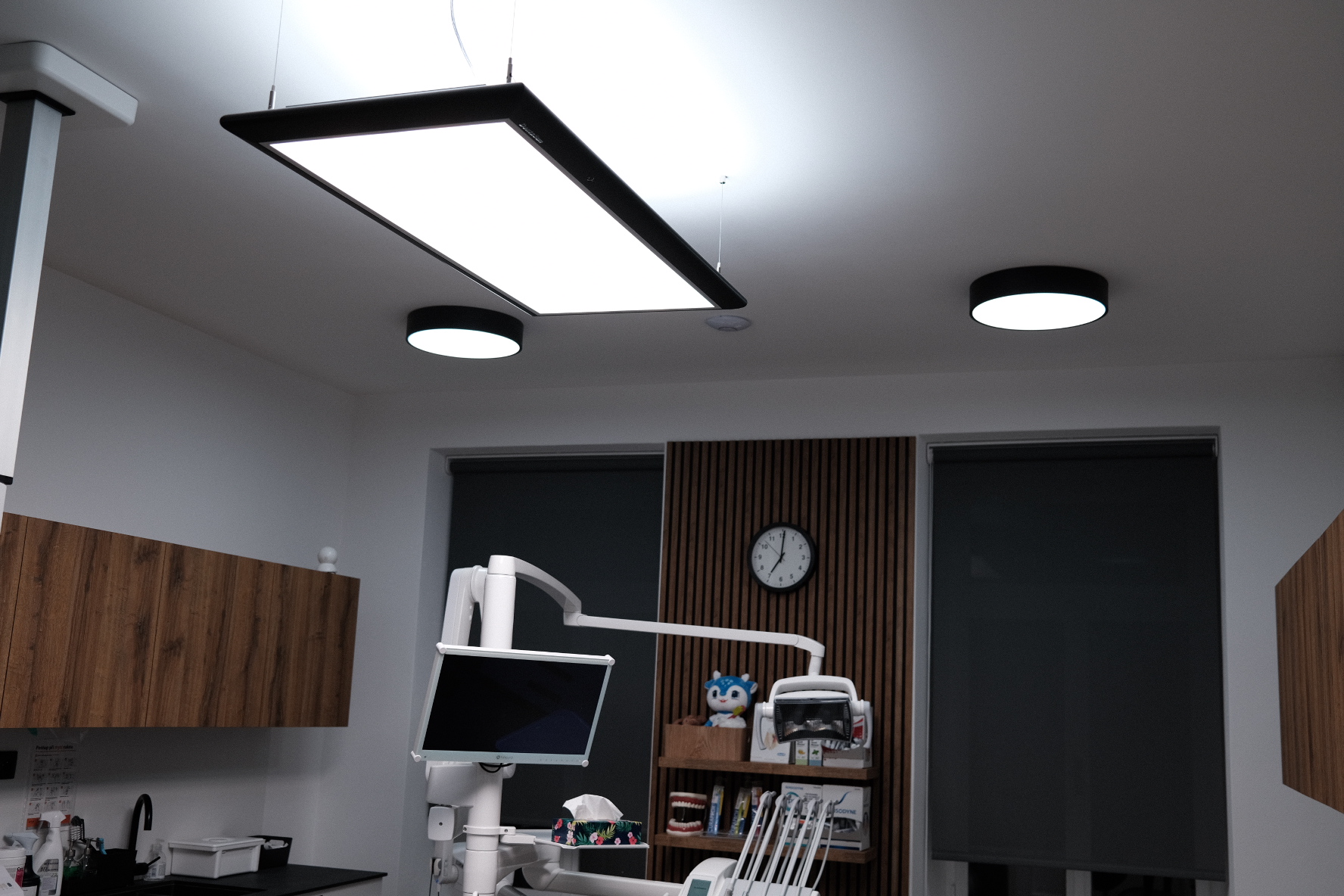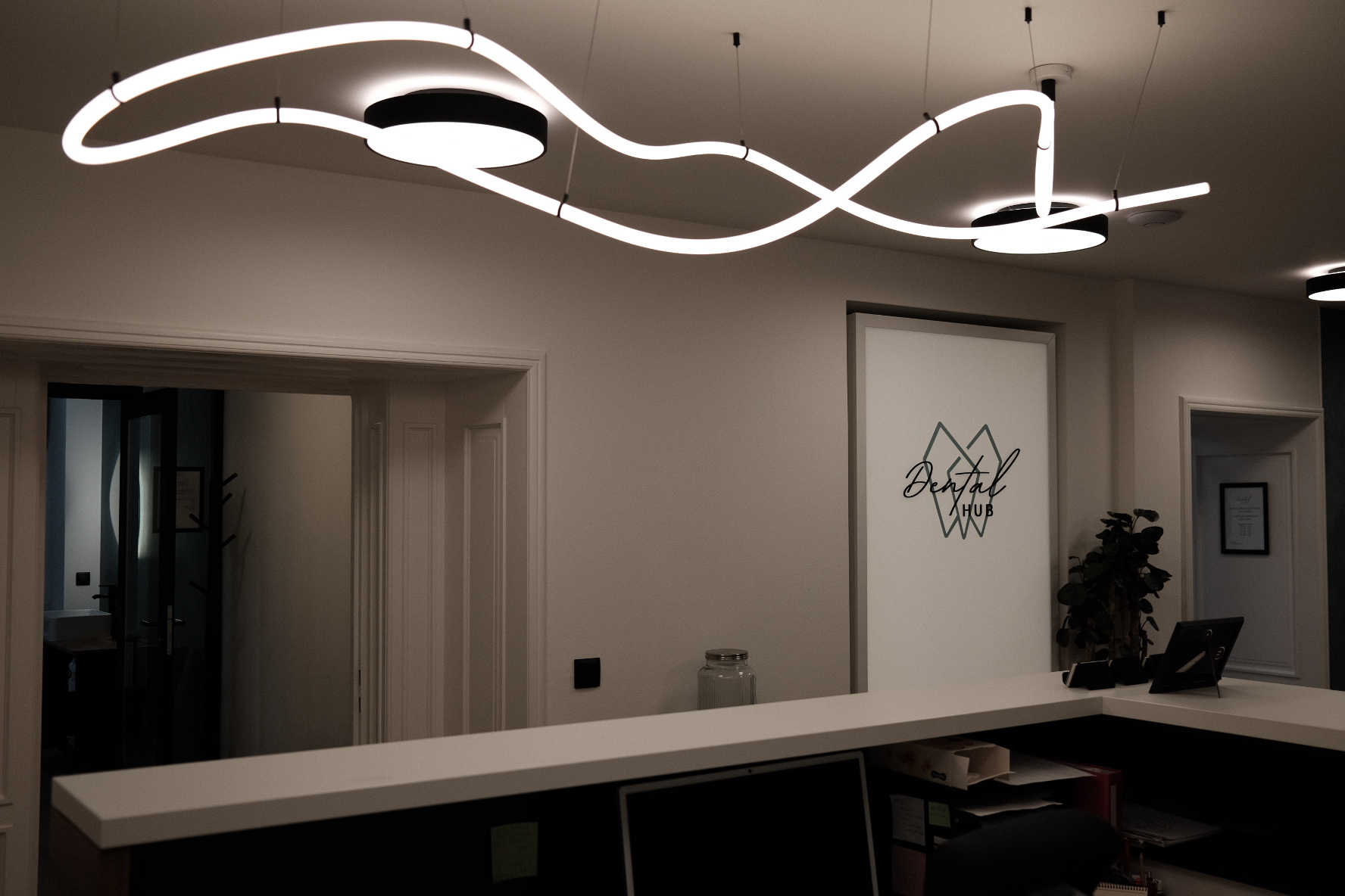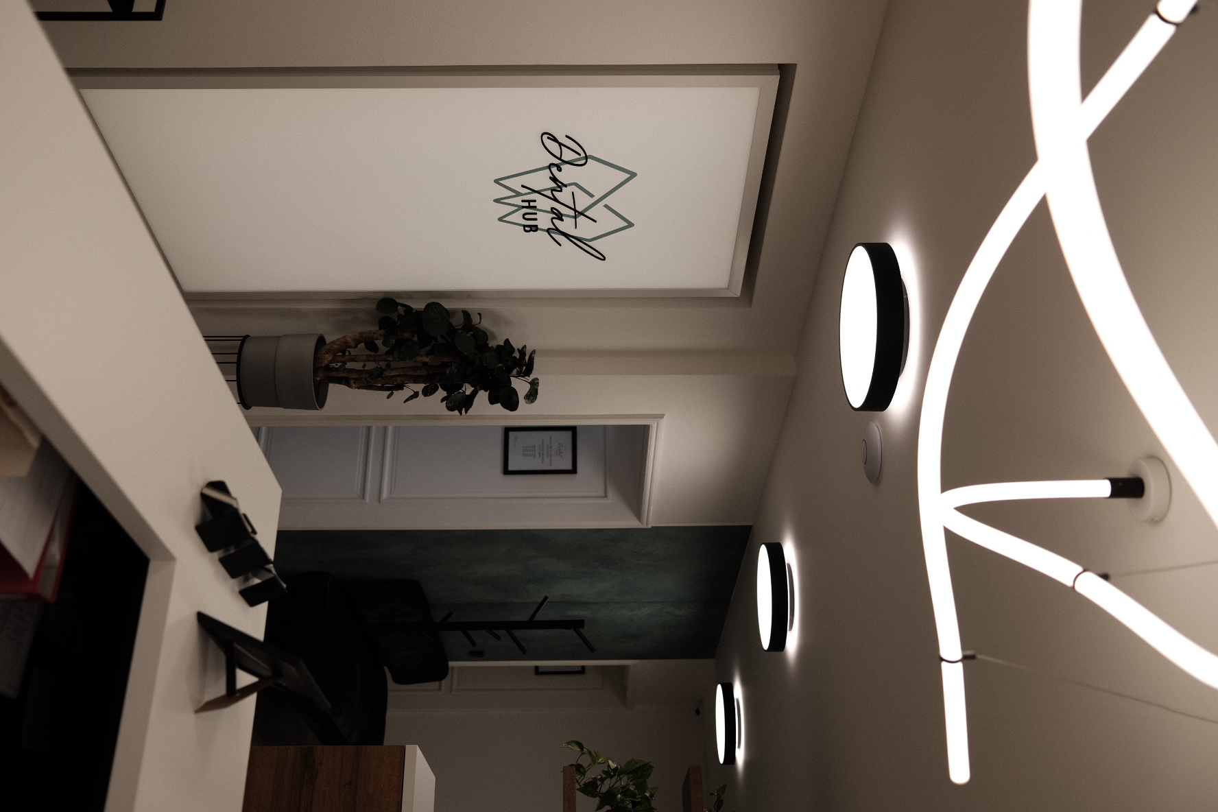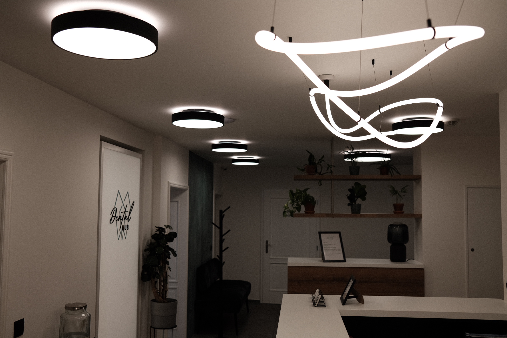 Realizace profesionálního osvětlení zubní ordinace Dental HUB v Brně. Použili jsme technická svítidla pro účely správného nasvětlení ordinace ale zároveň designový neonový LED pásek pro zútulnění atmosféry pro pacienty na recepci.