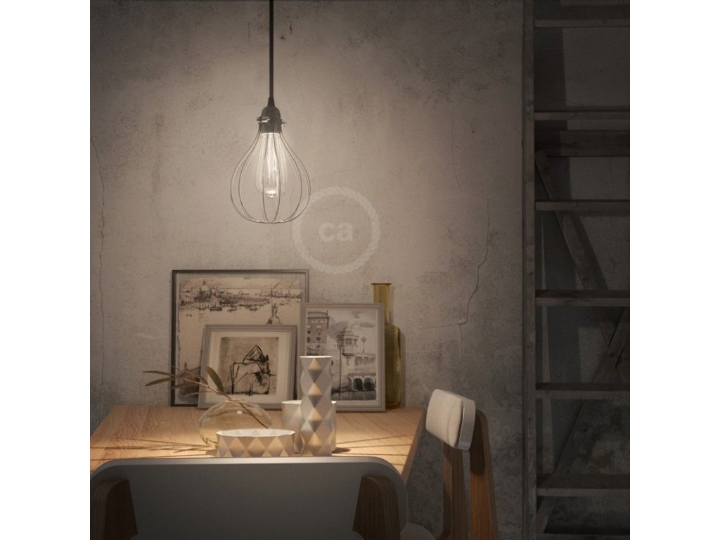 Nadčasový půvabvintage svítidel vložený do stínidla! Toto kovové klecové stínidlo tvaru kapka je inspirované industriálním a steampunkovým stylem. Díky jeho nastavitelné svorce se dá připevnt na jakoukoli E27 objímku a když se zkombinuje s jedním z našich barevných textilních kabelů vzniknejedinečné závěsné svítidlo vhodné do jakéhokoli interiéru, ať už domácího nebo veřejného. Z menu si vyberte barevné provedení, které nejvíce vyhovuje barvě a stylu vašeho interiéru, přidejte jednu z našich E27 objímek (my doporučujeme hladkou černou bakelitovou objímku) a celé svítidlo rozsviťte Edison žárovkou ST64 s LED vláknem.