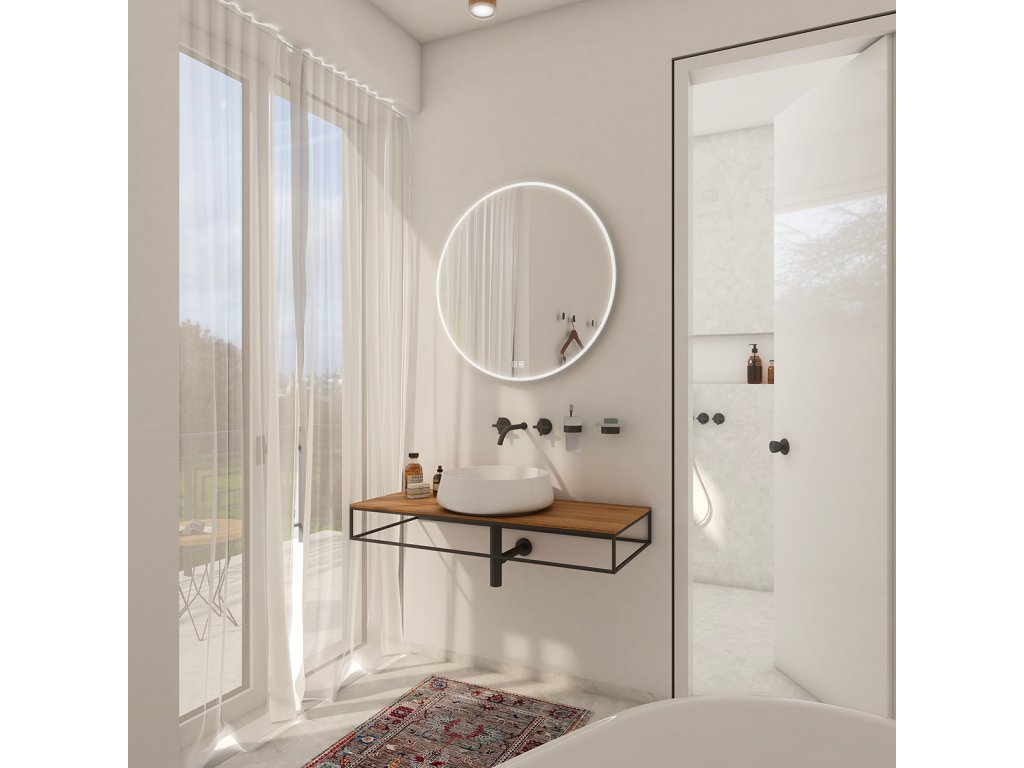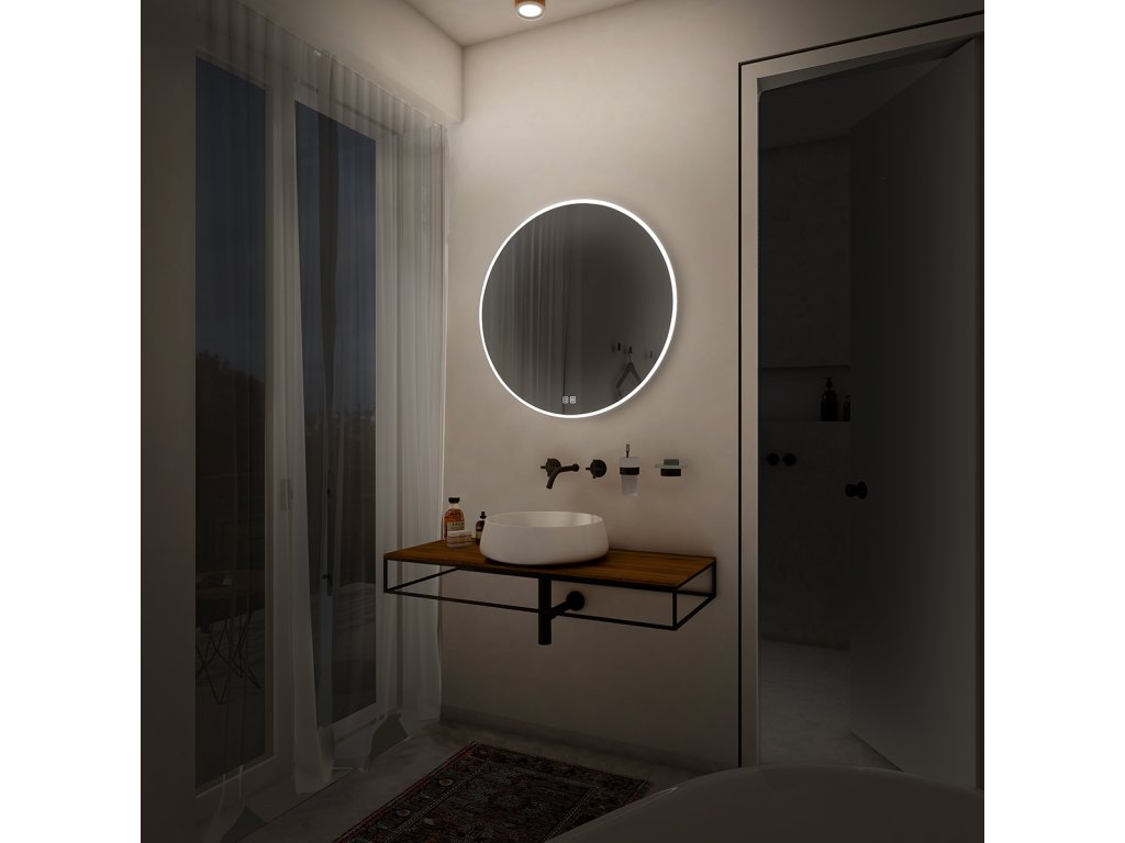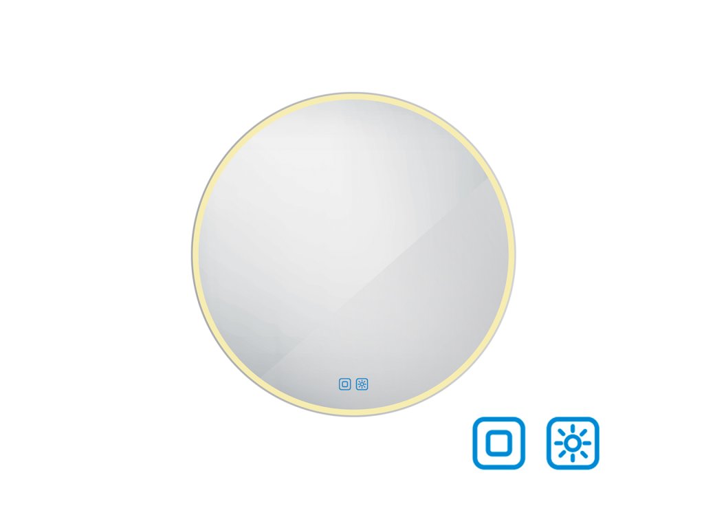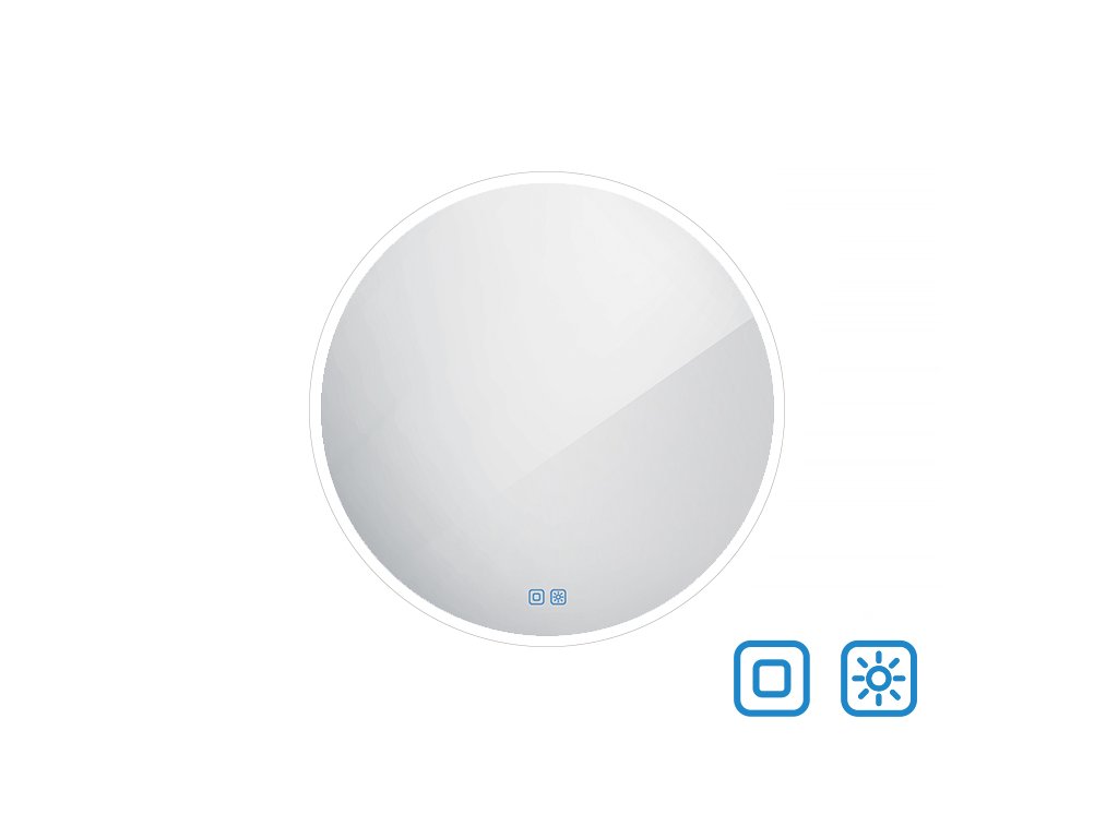 Kulaté bezrámové zrcadlo a s celoobvodovým podsvícením pro dokonalé a rovnoměrné osvětlení. Zrcadlo se ovládá dvěma dotykovými podsvícenými senzory, které umožňují změnu barvy podsvícení, nastavení intenzity osvětlení (stmívání) a disponují paměťovou funkcí pro uložení posledního nastavení. Kromě toho lze zrcadlo ovládat i pomocí nástěnného vypínače, což zvyšuje jeho flexibilitu a pohodlí použití. Ke zlepšení kvality podsvícení je použit difuzor z akrylového skla, který zajišťuje rovnoměrný a měkký rozptyl světla.