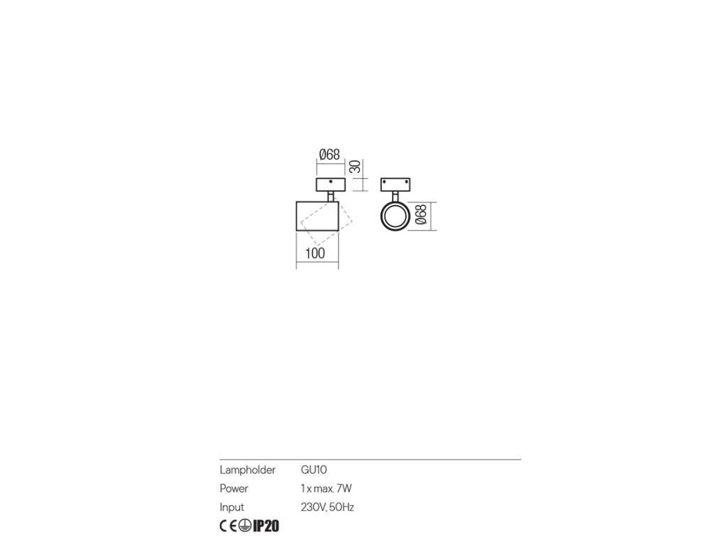 Nastavitelný interiérový miniprojektor, stropní nebo nástěnný, pro LED žárovky PAR16, GU10. Kryt z extrudovaného hliníku, zvenku elektrostaticky lakovaný k dispozici ve více barevných variantách, detaily matně černé. Zdroj GU10 není součástí balení.