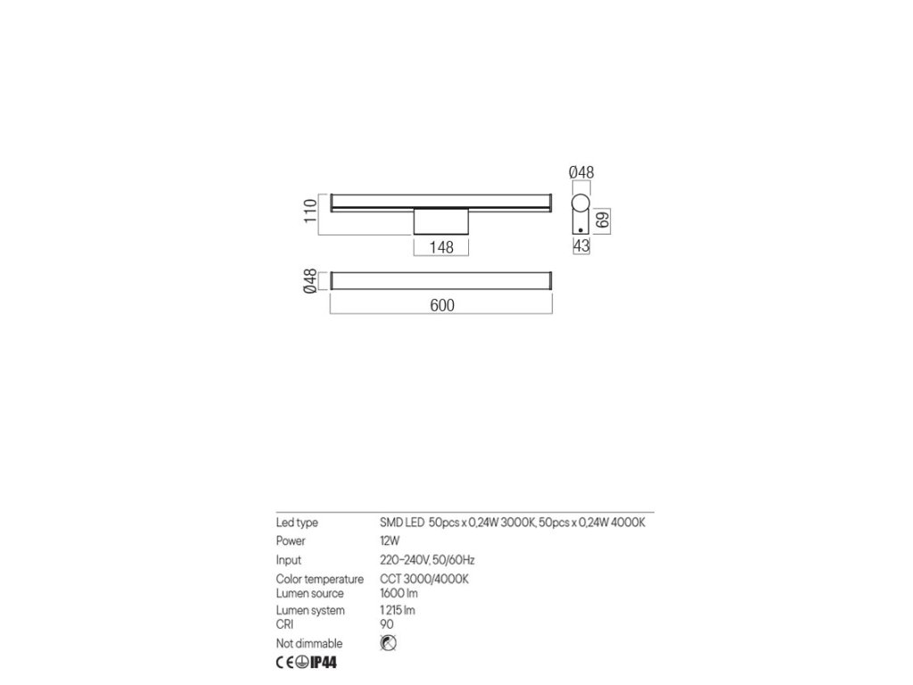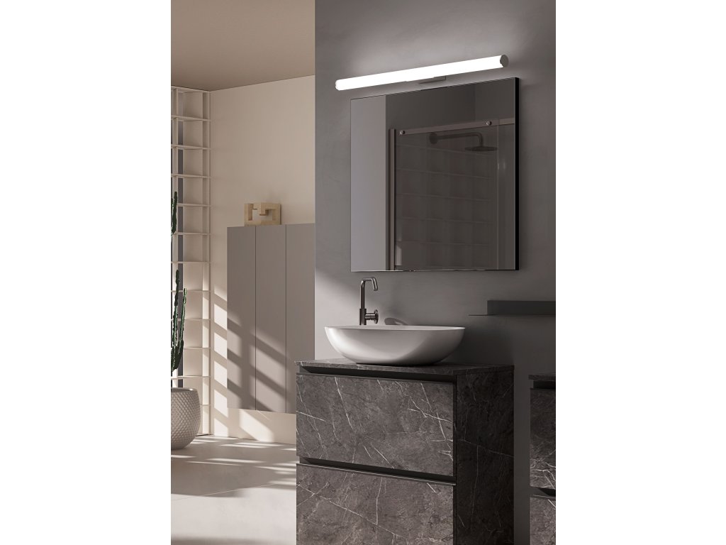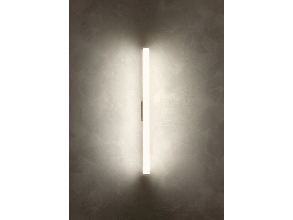 Interiérové nástěnné svítidlo chráněné proti vlhkosti, vybavené LED diodami SMD, volitelná teplota barvy světla, kovová a hliníková konstrukce elektrostaticky lakovaná k dispozici ve více barevných variantách a opálové polykarbonátové stínidlo.