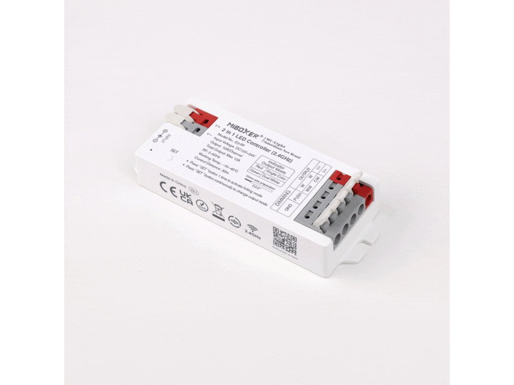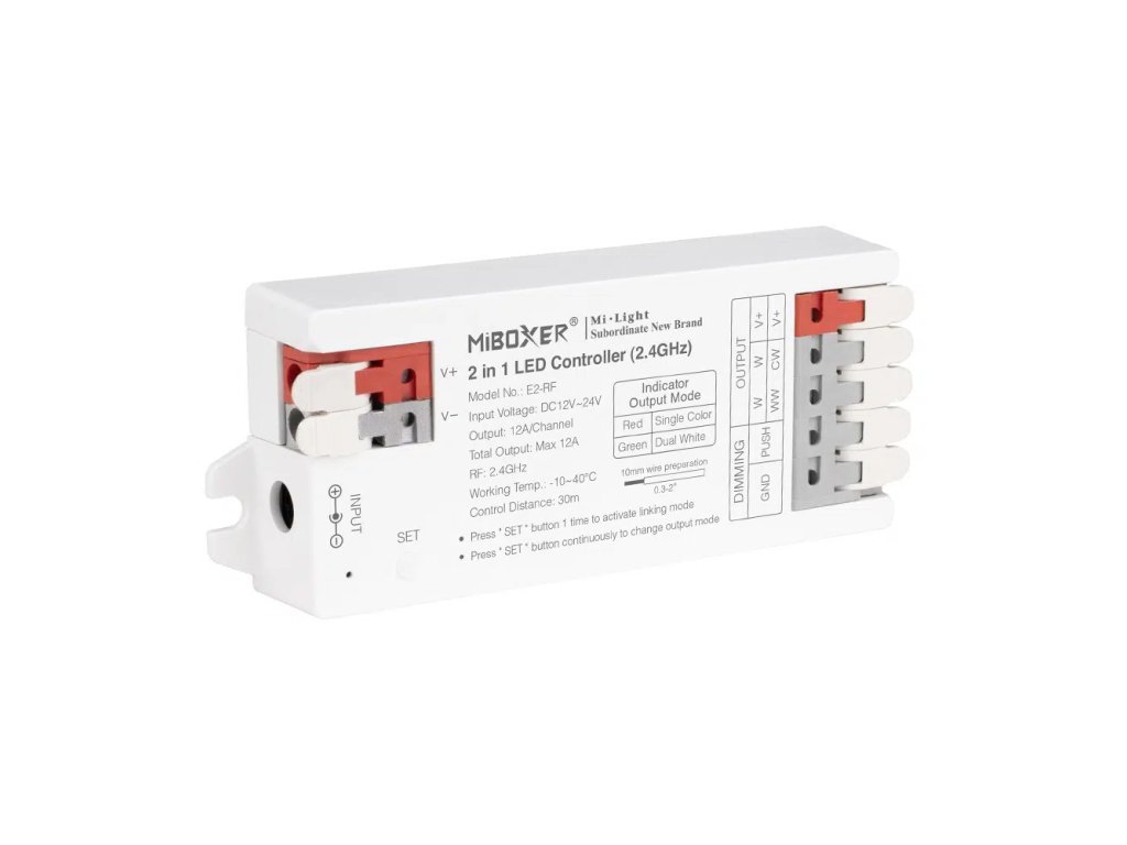 Univerzální řídící jednotka Mi-Light E2-RF s páčkovou svorkovnicí umožňuje ovládání jednobarevných LED pásků a CCT pásků s napětím 12V-24V a proudem 12A.