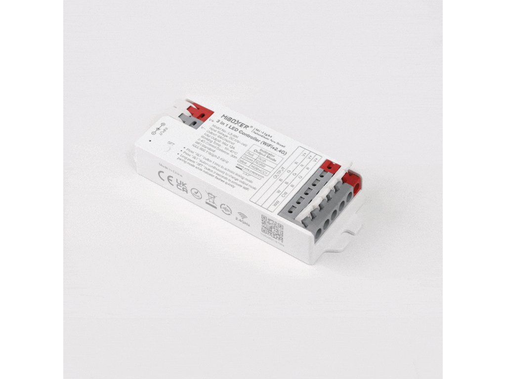 Chytrá řídící jednotka 3v1 Mi-Light E3-WR s páčkovou svorkovnicí, slouží k ovládání RGB, RGBW, RGB+CCT pásků přes WiFi signál.