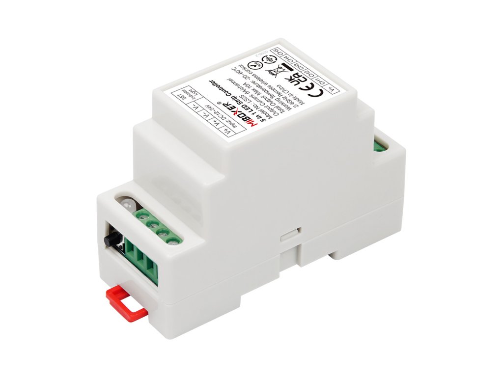 Mi-Light 5v1 je multifunkční přijímač na DIN lištu, který pracuje na frekvenci 2,4GHz a je vhodný pro ovládání všech typů LED pásků - CCT, RGB, RGBW RGB-CCT i jednobarevných, s vestavěným tlačítkem pro volbu režimu.