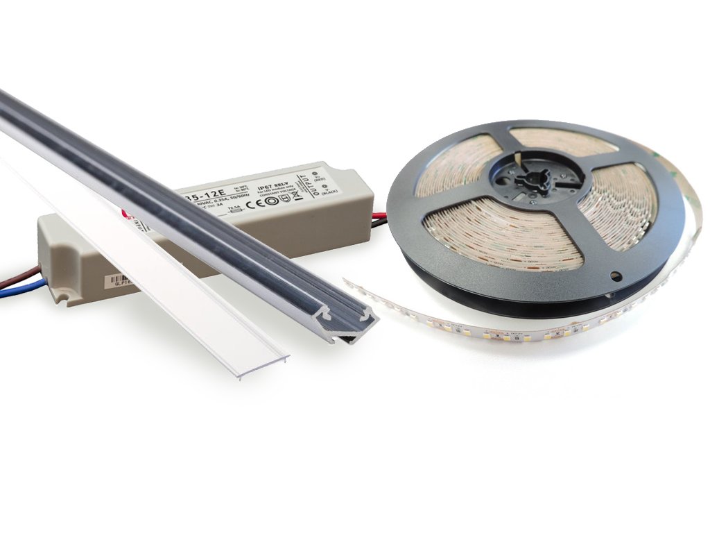 Sestava o délce 3 metry, 4 metry a 5 metrů se dodává s hliníkovým profilem v délce 2+1, 2+2 nebo 2+2+1 metr profilu. LED pásek je dodávaný v požadované délce v celku. V případě, že máte zájem o profil dlouhý 3 nebo 4 metry vcelku, prosím kontaktujte nás před objednáním emailem nebo telefonicky. Profily v délce 5 metrů vcelku nejsou k dispozici.