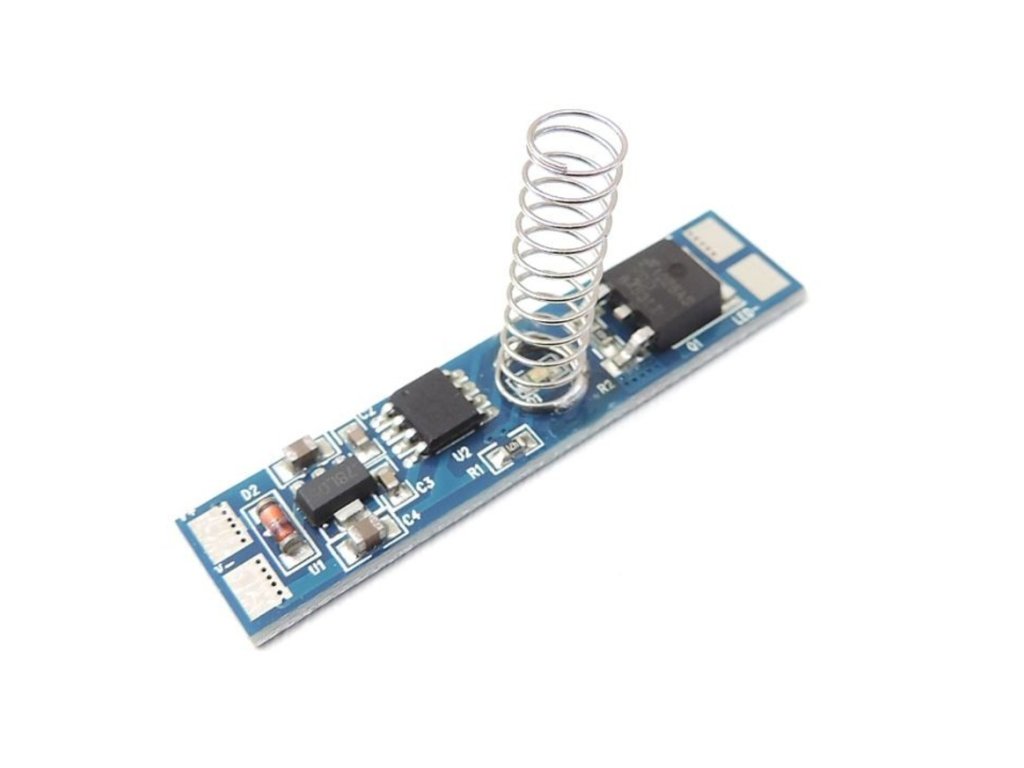 LED ovladač / stmívač pro hliníkové profily. Ovladač je určen pro přímou instalaci mezi přívodní kabel a LED pásek. Díky šířce pouze 10mm se vleze do většiny hliníkových profilů a je možno ho tedy instalovat do profilu přímo s LED páskem. Je ovládán přiložením ruky/dlaně/prstu na místo kde je instalován. Místo ve kterém ovladač dotyk rozpozná je osvětleno modrou kontrolkou. LED ovladač umožňuje kromě zapnutí/vypnutí také nastavit intenzitu LED pásku v rozmezí 10-100%. Režim stmívání se aktivuje dlouhým dotykem na modré kontrolce při rozsvíceném LED pásku. Při prvním přidržení začne ovladač LED pásek stmívat, po oddálení ruky se intenzita světla zastaví na dané hodnotě. Opakovaným přidržením ruky se funkce otočí a ovladač začne intenzitu světla zvyšovat, pokud nedojde k oddálení ruky v průběhu zvyšování intenzity, stmívač nastaví svit na 100%.