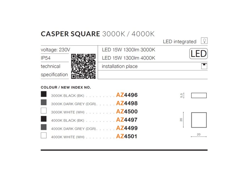 - CASPER square IP54 má čtvercový kovový prstenec s jedním integrovaným LED světelným zdrojem uprostřed, krytým akrylovým, mléčně bílým krytem