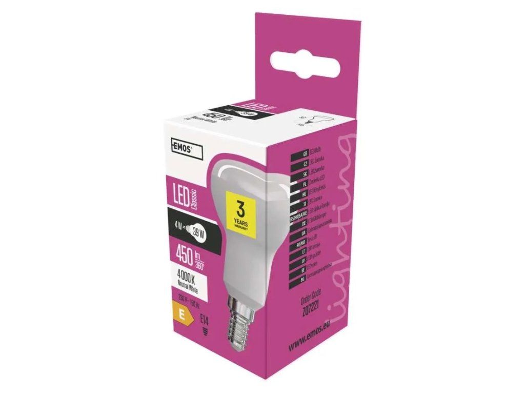 barva světla: neutrální bílá|energetická třída: E|index podání barev (CRI): 80|kompatibilita: –|náhrada za žárovku: 39 W|napětí: 230 V~/50 Hz|notifikace do mobilní aplikace: –|ovládání hlasovými asistenty: –|patice (uchycení žárovky): E14|počet čipů: neuvádí se|počet spínacích cyklů: 25 000|podporované OS: –|přenosová frekvence: –|příkon: 4 W|prodejní obal: 1 ks, krabička|protokol: –|řada: CLASSIC|rozměr: 85 × 50 × 50 mm|stmívatelná: ne|světelná účinnost: 113 lm/W|světelný tok: 450 lm|technologie: LED|teplota chromatičnosti: 4 000 K|tvar: R50|typ čipů: SMD|účiník: 0,49|úhel vyzařování: 120°|záruční doba: 3 roky|životnost: 30 000 hodinDoplňkové parametry