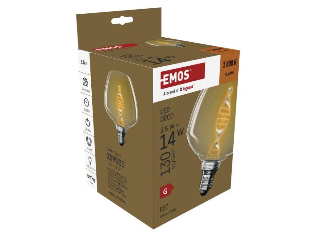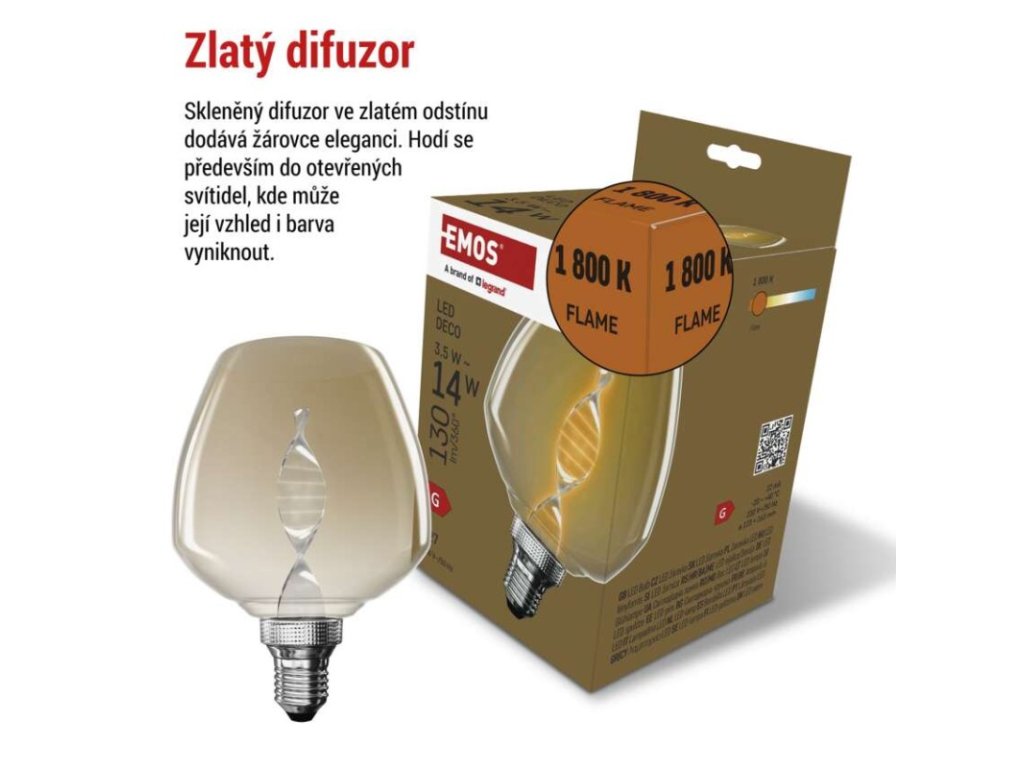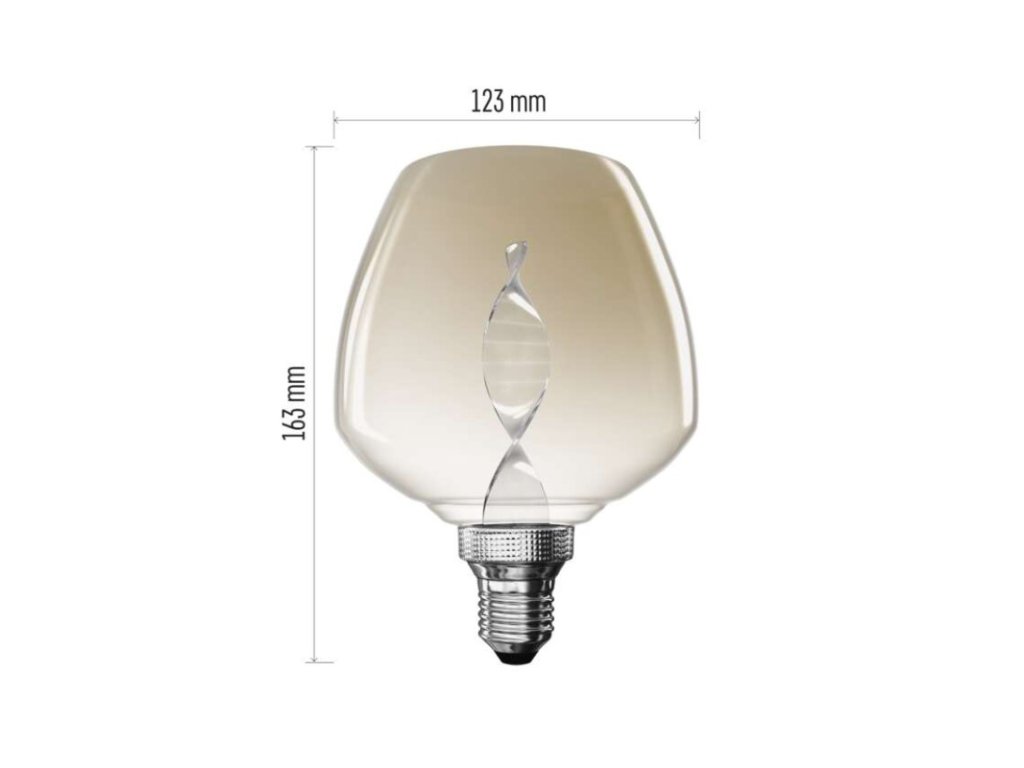 barva světla: Flame|energetická třída: G|index podání barev (CRI): 80|kompatibilita: neuvádí se|náhrada za žárovku: 14 W|napětí: 230 V~/50 Hz|notifikace do mobilní aplikace: neuvádí se|ovládání hlasovými asistenty: neuvádí se|patice (uchycení žárovky): E27|počet čipů: neuvádí se|počet spínacích cyklů: 25 000|podporované OS: neuvádí se|přenosová frekvence: neuvádí se|příkon: 3,5 W|prodejní obal: 1 ks, krabička|protokol: neuvádí se|řada: DECO|rozměr: 126 × 126 × 163 mm|stmívatelná: ne|světelná účinnost: 37 lm/W|světelný tok: 130 lm|technologie: LED|teplota chromatičnosti: 1 800 K|tvar: S123|typ čipů: COB|účiník: 0,40|úhel vyzařování: 330°|záruční doba: 2 roky|životnost: 25 000 hodinDoplňkové parametry