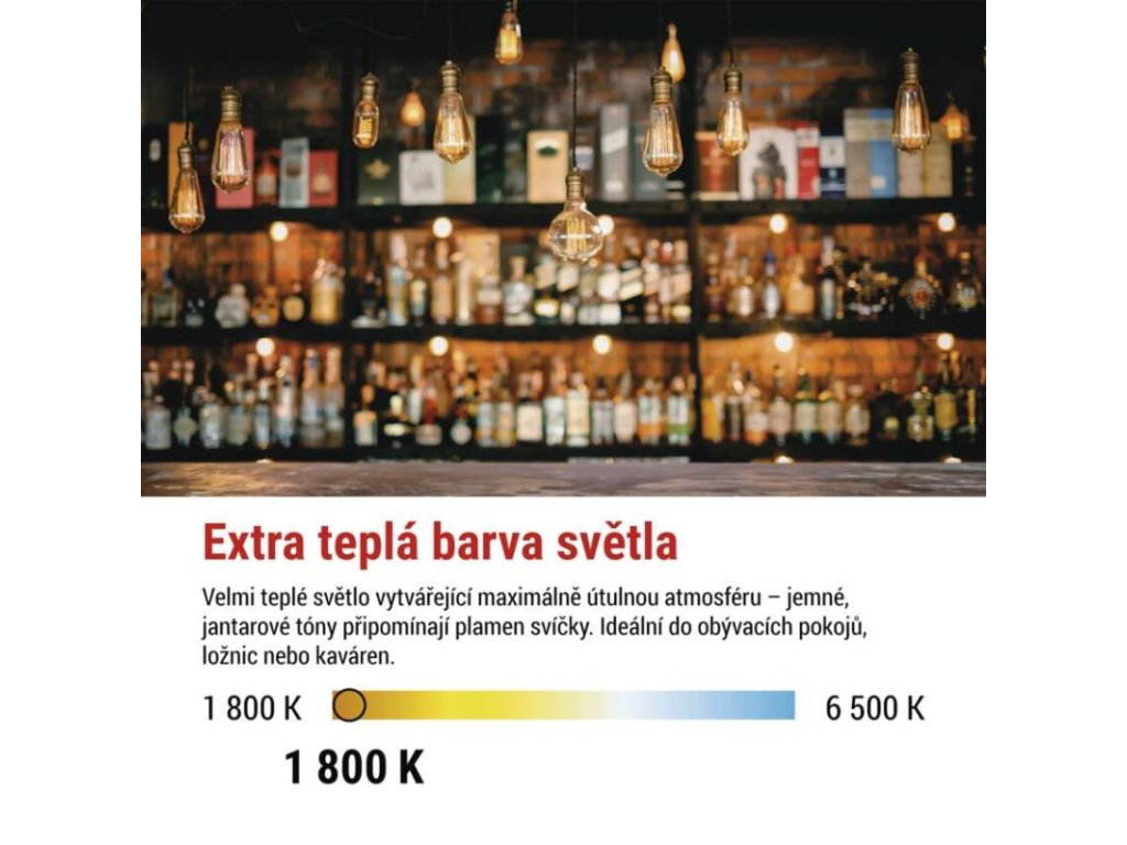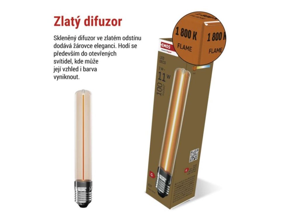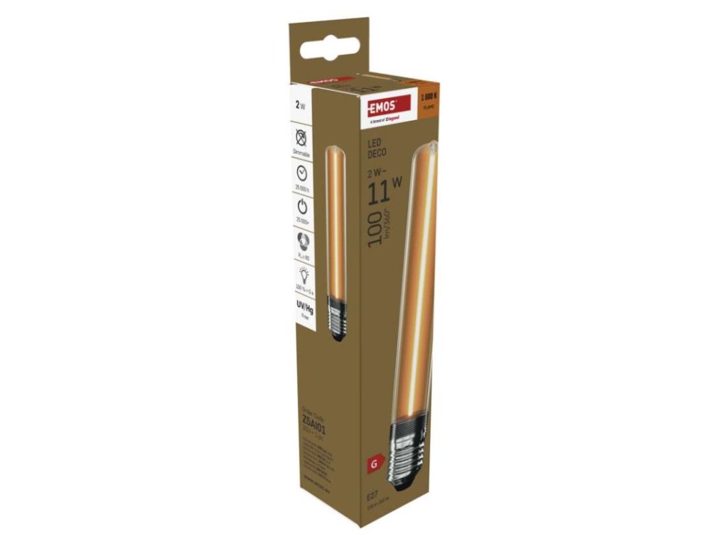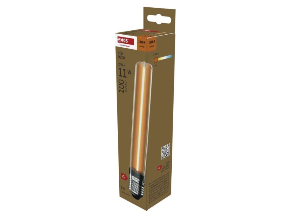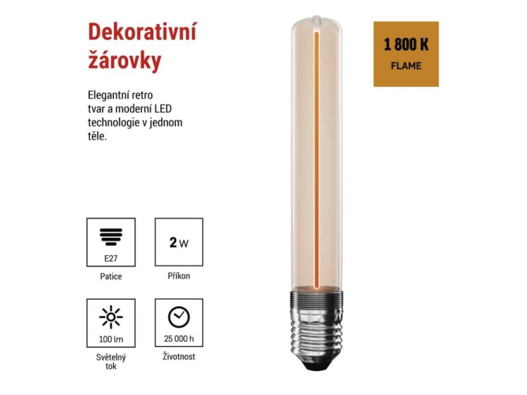 barva světla: Flame|energetická třída: G|index podání barev (CRI): 80|kompatibilita: neuvádí se|náhrada za žárovku: 11 W|napětí: 230 V~/50 Hz|notifikace do mobilní aplikace: neuvádí se|ovládání hlasovými asistenty: neuvádí se|patice (uchycení žárovky): E27|počet čipů: neuvádí se|počet spínacích cyklů: 25 000|podporované OS: neuvádí se|přenosová frekvence: neuvádí se|příkon: 2 W|prodejní obal: 1 ks, krabička|protokol: neuvádí se|řada: DECO|rozměr: 30 × 30 × 187 mm|stmívatelná: ne|světelná účinnost: 50 lm/W|světelný tok: 100 lm|technologie: LED|teplota chromatičnosti: 1 800 K|tvar: T30|typ čipů: COB|účiník: 0,40|úhel vyzařování: 330°|záruční doba: 2 roky|životnost: 25 000 hodinDoplňkové parametry