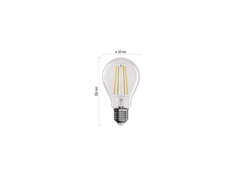 barva světla: teplá bílá|energetická třída: D|index podání barev (CRI): 80|kompatibilita: neuvádí se|náhrada za žárovku: 75 W|napětí: 230 V~/50 Hz|notifikace do mobilní aplikace: neuvádí se|ovládání hlasovými asistenty: neuvádí se|patice (uchycení žárovky): E27|počet čipů: neuvádí se|počet spínacích cyklů: 25 000|podporované OS: neuvádí se|přenosová frekvence: neuvádí se|příkon: 7,5 W|prodejní obal: 1 ks, krabička|protokol: neuvádí se|řada: FILAMENT|rozměr: 60 × 60 × 106 mm|stmívatelná: ano|světelná účinnost: 141 lm/W|světelný tok: 1 055 lm|technologie: LED|teplota chromatičnosti: 2 700 K|tvar: A60|typ čipů: COB|účiník: 0,73|úhel vyzařování: 320°|záruční doba: 3 roky|životnost: 25 000 hodinParametry produktu:
