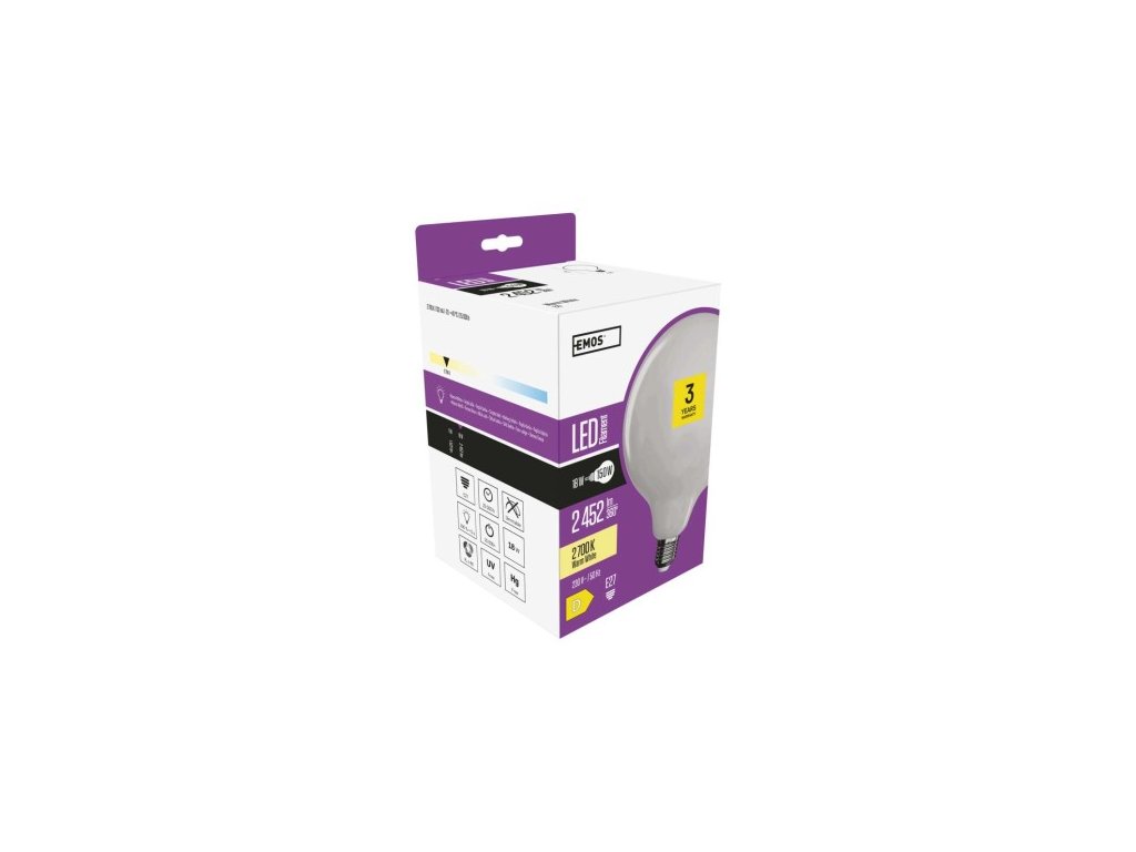 barva světla: teplá bílá|energetická třída: D|index podání barev (CRI): 80|kompatibilita: –|náhrada za žárovku: 150 W|napětí: 230 V~/50 Hz|notifikace do mobilní aplikace: –|ovládání hlasovými asistenty: –|patice (uchycení žárovky): E27|počet čipů: 4|počet spínacích cyklů: 25 000|podporované OS: –|přenosová frekvence: –|příkon: 18 W|prodejní obal: 1 ks, krabička|protokol: –|řada: FILAMENT|rozměr: 178 × 125 × 125 mm|stmívatelná: ne|světelná účinnost: 136 lm/W|světelný tok: 2 452 lm|technologie: LED|teplota chromatičnosti: 2 700 K|tvar: Globe|typ čipů: COB|účiník: 0,59|úhel vyzařování: 340°|záruční doba: 3 roky|životnost: 25 000 hodinDoplňkové parametry