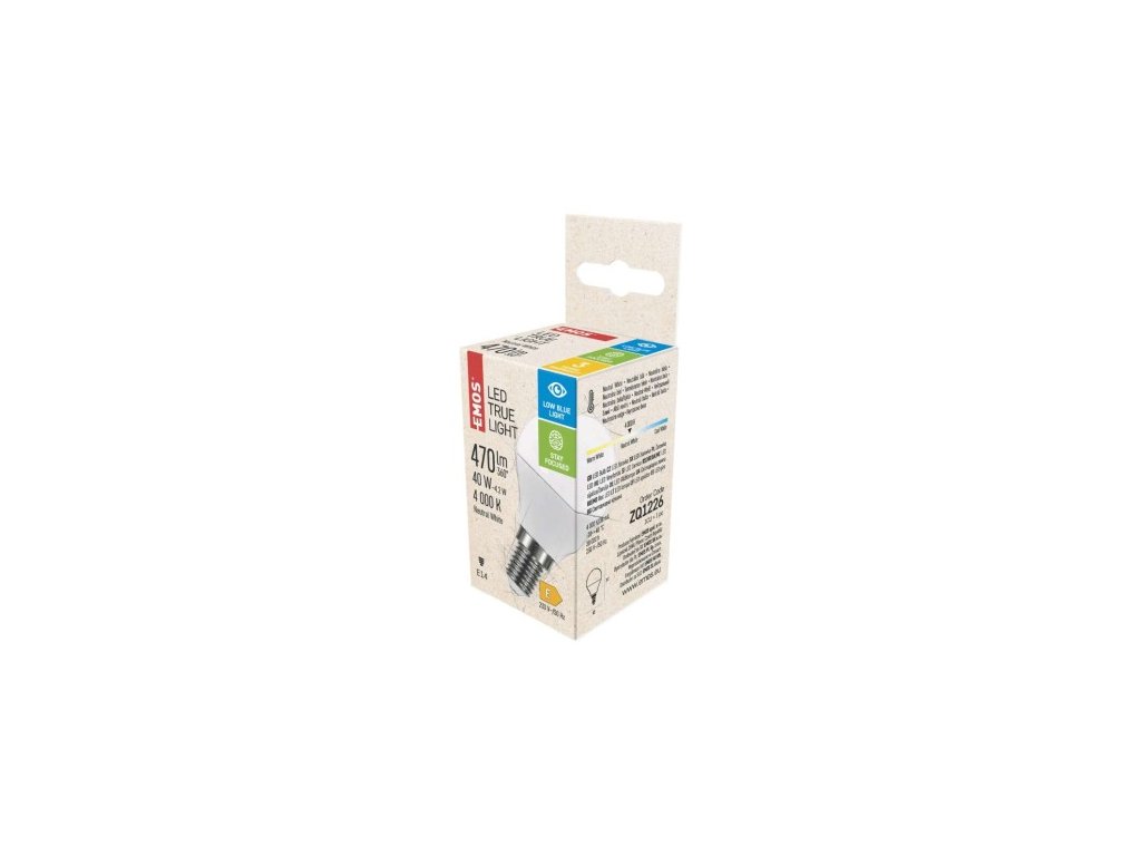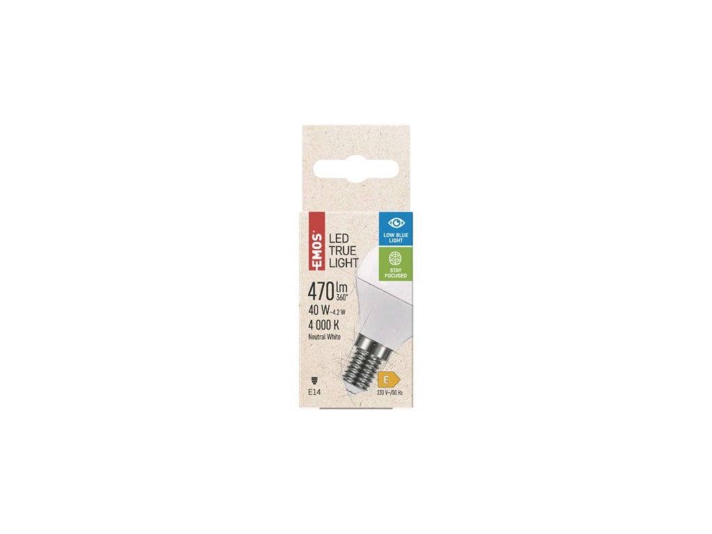 barva světla: neutrální bílá|energetická třída: E|index podání barev (CRI): 94|kompatibilita: –|náhrada za žárovku: 40 W|napětí: 230 V~/50 Hz|notifikace do mobilní aplikace: –|ovládání hlasovými asistenty: –|patice (uchycení žárovky): E14|počet čipů: 18|počet spínacích cyklů: 25 000|podporované OS: –|přenosová frekvence: –|příkon: 4,2 W|prodejní obal: 1 ks, krabička|protokol: –|řada: TRUE LIGHT|rozměr: 78 × 45 × 45 mm|stmívatelná: ne|světelná účinnost: 112 lm/W|světelný tok: 470 lm|technologie: LED|teplota chromatičnosti: 4 000 K|tvar: Mini Globe|typ čipů: SMD|účiník: 0,50|úhel vyzařování: 200°|záruční doba: 3 roky|životnost: 30 000 hodinDoplňkové parametry