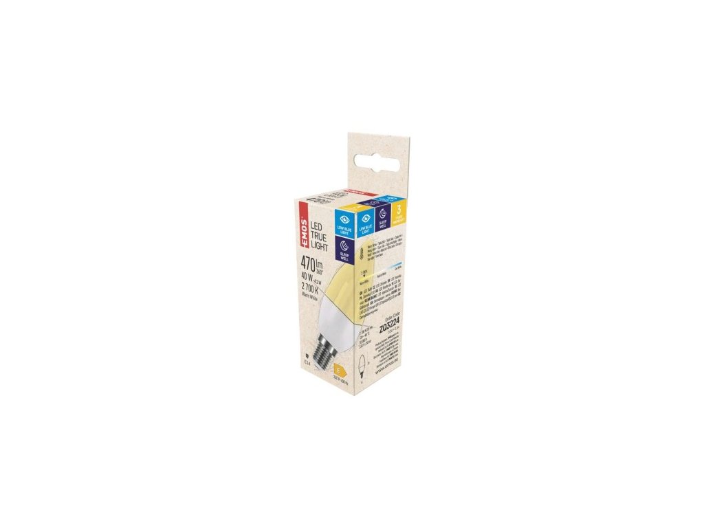 barva světla: teplá bílá|energetická třída: E|index podání barev (CRI): 94|kompatibilita: –|náhrada za žárovku: 40 W|napětí: 230 V~/50 Hz|notifikace do mobilní aplikace: –|ovládání hlasovými asistenty: –|patice (uchycení žárovky): E14|počet čipů: 18|počet spínacích cyklů: 25 000|podporované OS: –|přenosová frekvence: –|příkon: 4,2 W|prodejní obal: 1 ks, krabička|protokol: –|řada: TRUE LIGHT|rozměr: 102 × 35 × 35 mm|stmívatelná: ne|světelná účinnost: 112 lm/W|světelný tok: 470 lm|technologie: LED|teplota chromatičnosti: 2 700 K|tvar: svíčka|typ čipů: SMD|účiník: 0,51|úhel vyzařování: 260°|záruční doba: 3 roky|životnost: 30 000 hodinDoplňkové parametry
