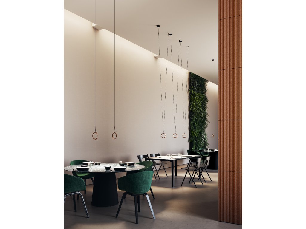 IVY is a minimal, geometric lighting piece composed of a ring hanging on a cable, which gives power to a made to measure LED module. Designed with single and double cables (IVY I and IVY V respectively), IVY responds to the need for flexibility, an increasingly contemporary theme in architectural practice and restoration, allowing the luminaire to be released from its ceiling derivation.