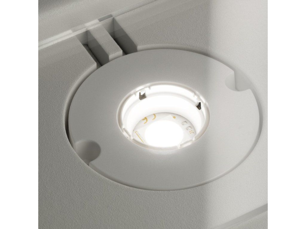 Světelné těleso z masivního hliníku s práškovým nástřikem. Jeden světelný zdroj chráněný čirým polykarbonátovým difuzorem.