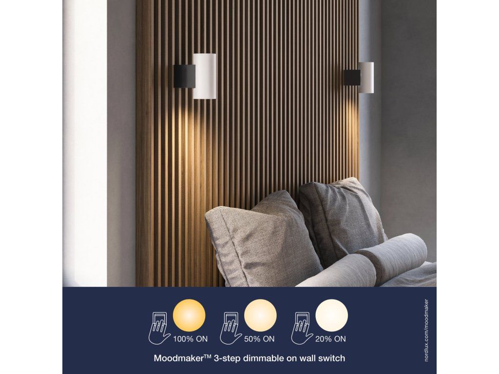 Curtiz je nástěnné svítidlo LED v minimalistickém designu. Svítí nahoru i dolů a vytváří útulnou atmosféru, kterou můžete regulovat pomocí vestavěného třístupňového stmívače Moodmaker™. Stmívač funguje pomocí spínače na přiloženém kabelu nebo běžného nástěnného vypínače, přičemž jas světla nastavíte jedním, dvěma nebo třemi cvaknutími spínače. Praktická vestavěná paměťová funkce si pamatuje poslední nastavení stmívače.