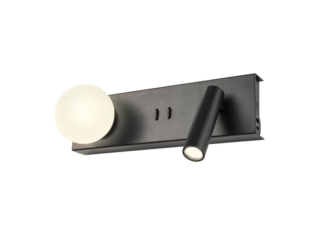 Nástěnné vnitřní svítidlo, vybavené SMD LED diodami, kovová a hliníková konstrukce, lakované v matné černé barvě, skleněný saténový opálově bílý difuzor, vybavené USB nabíjecím portem a vypínačem.
