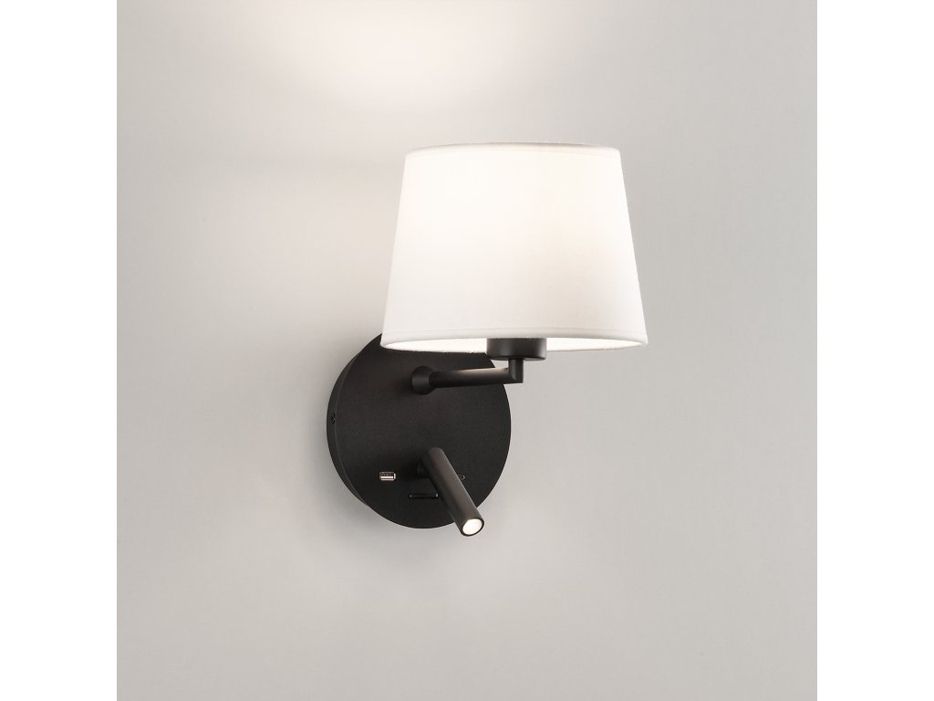 Moderní nástěnné svítidlo se stylovým designem ze série Stilo, vyrobené z černé kulaté kovové základny s ramenem, doplněné textilním stínidlem bílé barvy a navíc má k dispozici malou nastavitelnou čtecí bodovku.