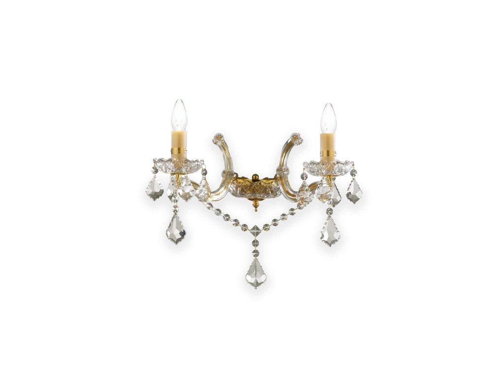Stylové křišťálové nástěnné svítidlo Florian z kolekce interiérového osvětlení značky Ideal Lux zazáří v jakémkoli interiéru. Rám se dvěma rameny je zhotoven z kvalitního kovu ve zlaté barvě kombinovaný s čirým sklem a je ozdoben křišťálovými přívěsky ve tvaru osmiúhelníků a kapek. Svítidlo je osazeno paticemi E14 pro žárovky o maximálním příkonu 2 x 40 W. Žárovky nejsou součástí balení, pro úsporu elektrické energie doporučujeme použít LED světelné zdroje ve tvaru svíčky (typ B35 a BA35). Krytí IP20 je vhodné pro použití do interiéru. Celkové rozměry svítidla činí 32 x 33 x 21 cm. Je určeno k napájení ze sítě na 220-240 V a vztahuje se na něj prodloužená záruka 5 let.Doplňkové parametry