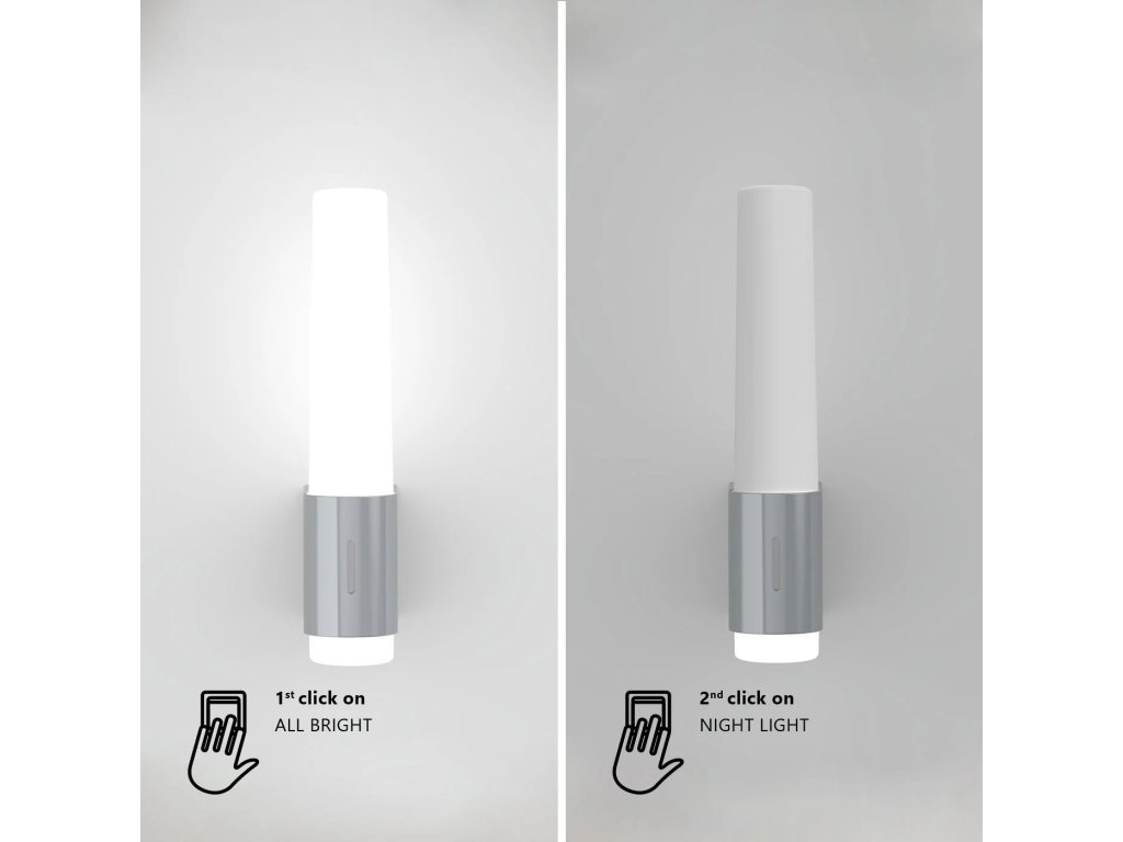 Svítidlo HELVA NIGHT s vyšší ochranou IP44 se skvěle hodí do Vaší koupelny. Vzhledem k použitým moderním technologiím nejde jen o pěkný designový kousek, ale o svítidlo, které poskytuje úsporné kvalitní světlo. Navíc jedním dotykem se rozzáří celé, druhým dotykem pouze spodní část. Držák svítidla nabízíme ve dvou barevných variantách chrom a bílá.