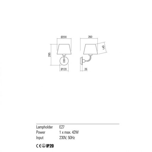 Nástěnná interiérová lampa s kovovou konstrukcí v matné bílé nebo černé barvě s matně zlatými hliníkovými detaily. Stínidlo je vyrobeno z bílé nebo černé textílie zvenčí a PVC uvnitř.