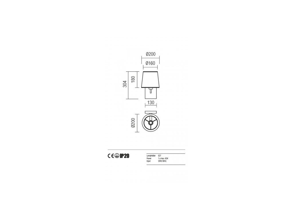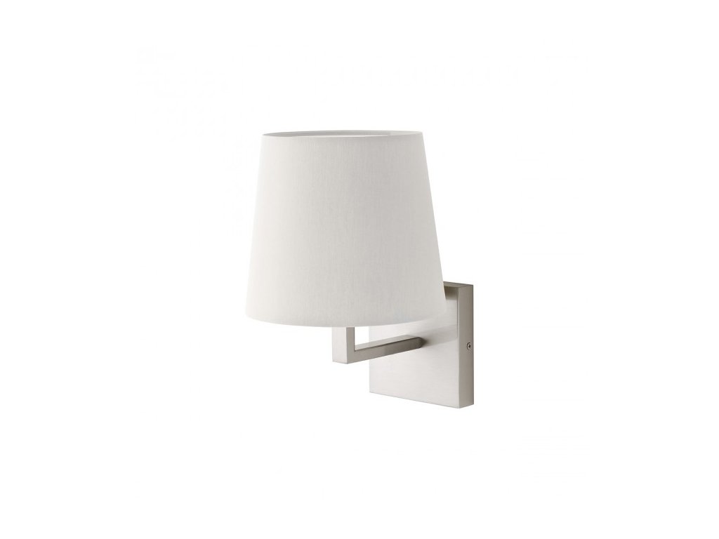 Nástěnné interiérové svítidlo s kovovou konstrukcí v barvě saténový nikl. Textilní stínidlo je kulatého tvaru v slonovinové barvě s kovovou konstrukcí s ohňivzdornou podložkou.