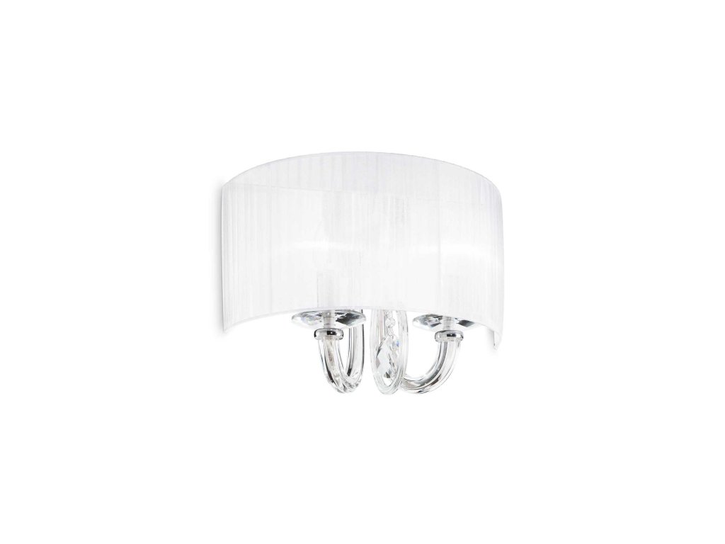 Stylové křišťálové nástěnné svítidlo Swan z kolekce interiérového osvětlení značky Ideal Lux o délce 44 cm zazáří v jakémkoli interiéru, je vhodné jako dodatkové osvětlení do ložnice, chodby či obývacího pokoje. Rám svítidla je zhotoven z kvalitního kovu v chromové barvě kombinovaný se dvěma ručně tvarovanými rameny z foukaného skla. Lustr je zdoben čirými křišťálovymi ověsky. Objímky jsou kryté difuzorem z překrývané bílé organzy. Nástěnka je osazena paticemi E14 pro žárovky o maximálním příkonu 2 x 40 W. Žárovky nejsou součástí balení, pro úsporu elektrické energie doporučujeme použít LED světelné zdroje. Krytí IP20 je vhodné pro použití do interiéru. Celkové rozměry svítidla činí 30 x 44 x 22 cm. Je určeno k napájení ze sítě na 220-240 V.Doplňkové parametry