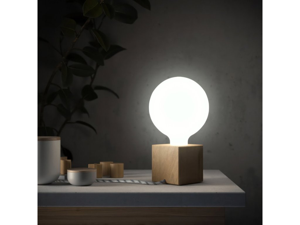 Posaluce cubetto, naše dřevěná stolní lampa s textilním kabelem, in-line vypínačem a dvoupólovou zástrčkou