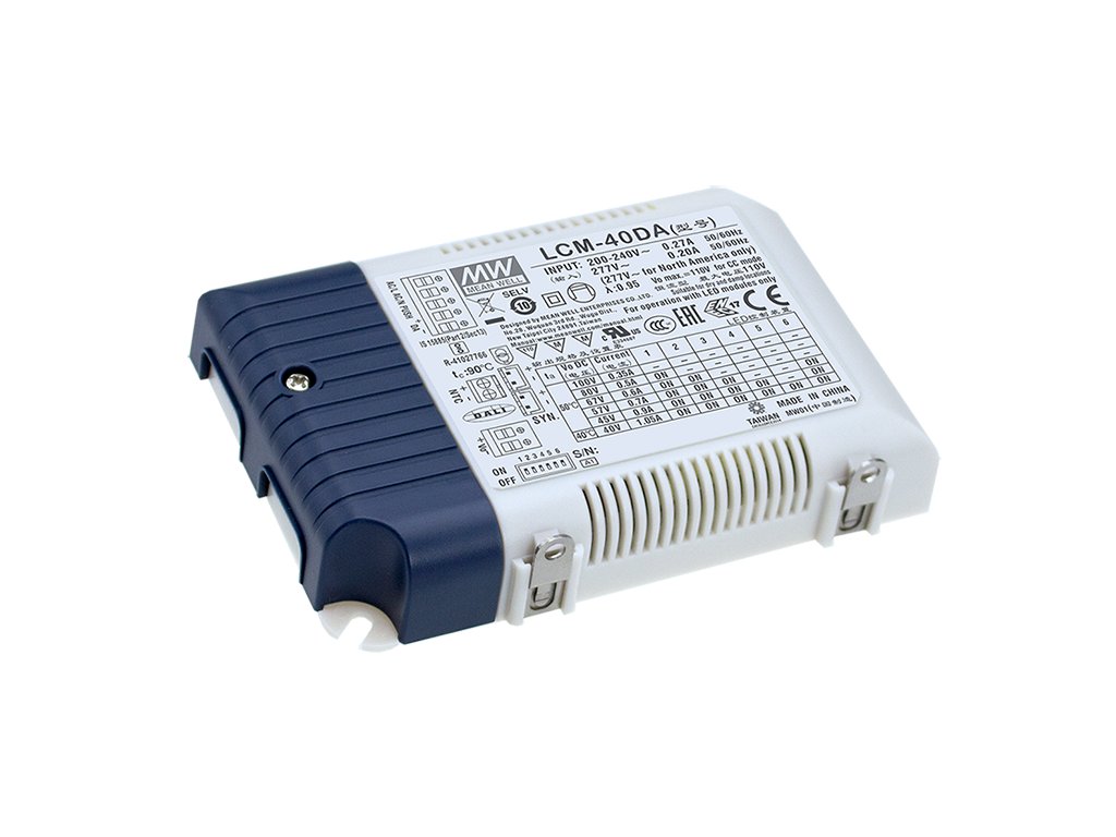 Pulzní proudový zdroj MEAN WELL pro LED aplikace s krytím IP20, s PFC, s funkcí řízení DALI2, výstupní proud lze nastavit pomocí DIP prepínače.