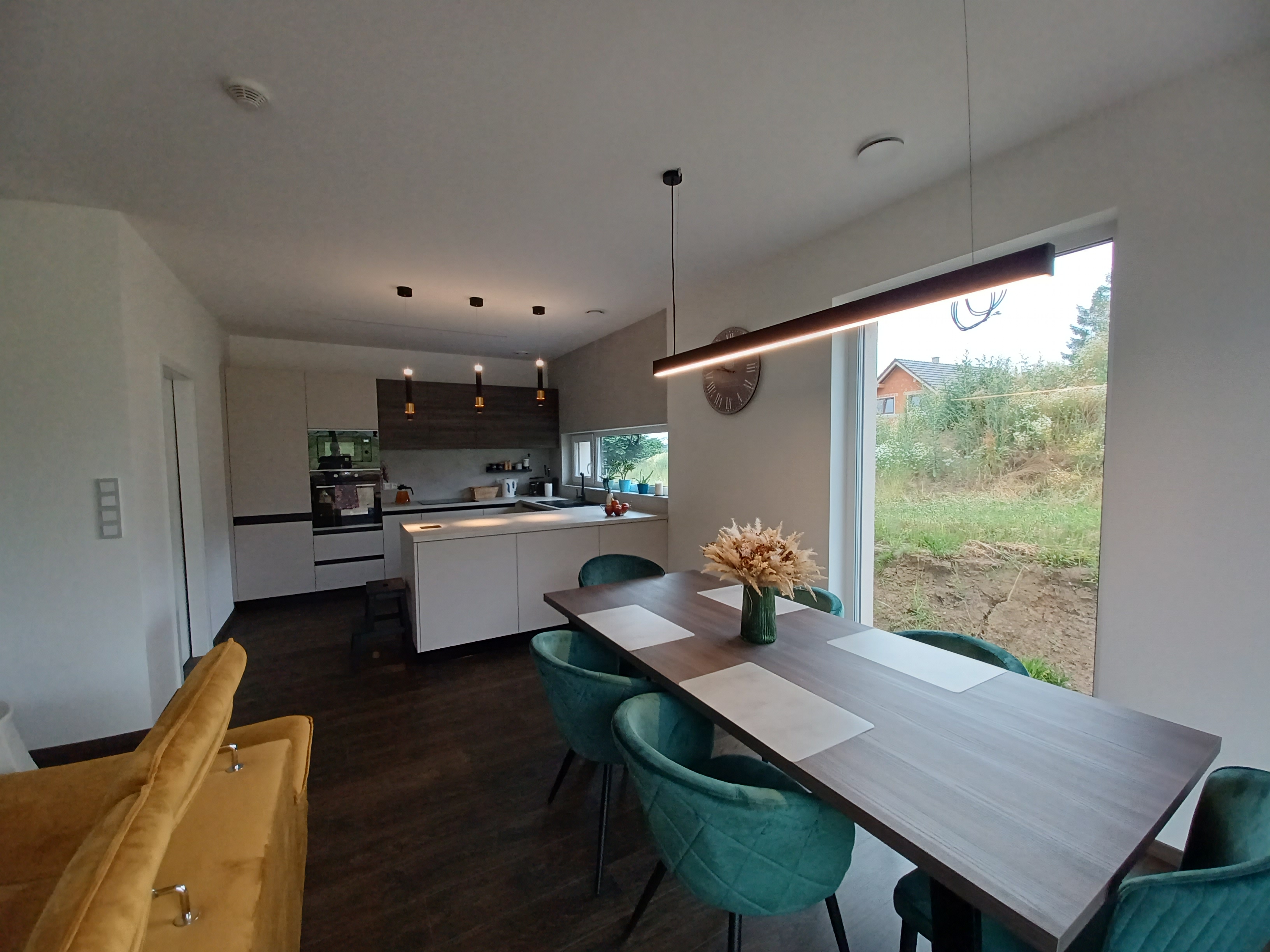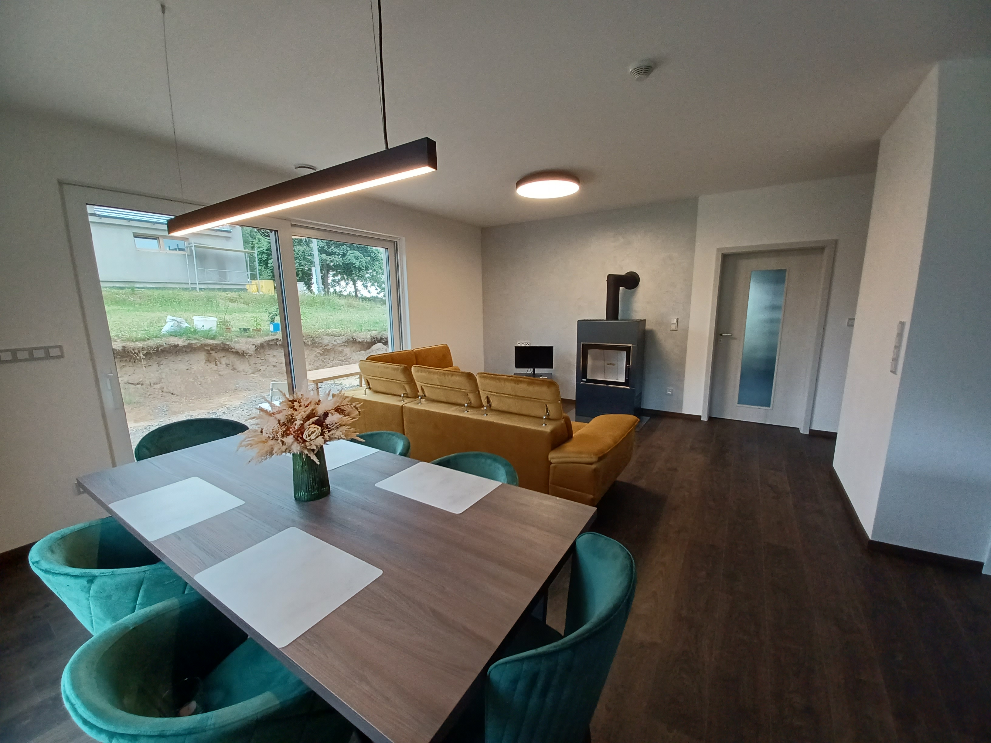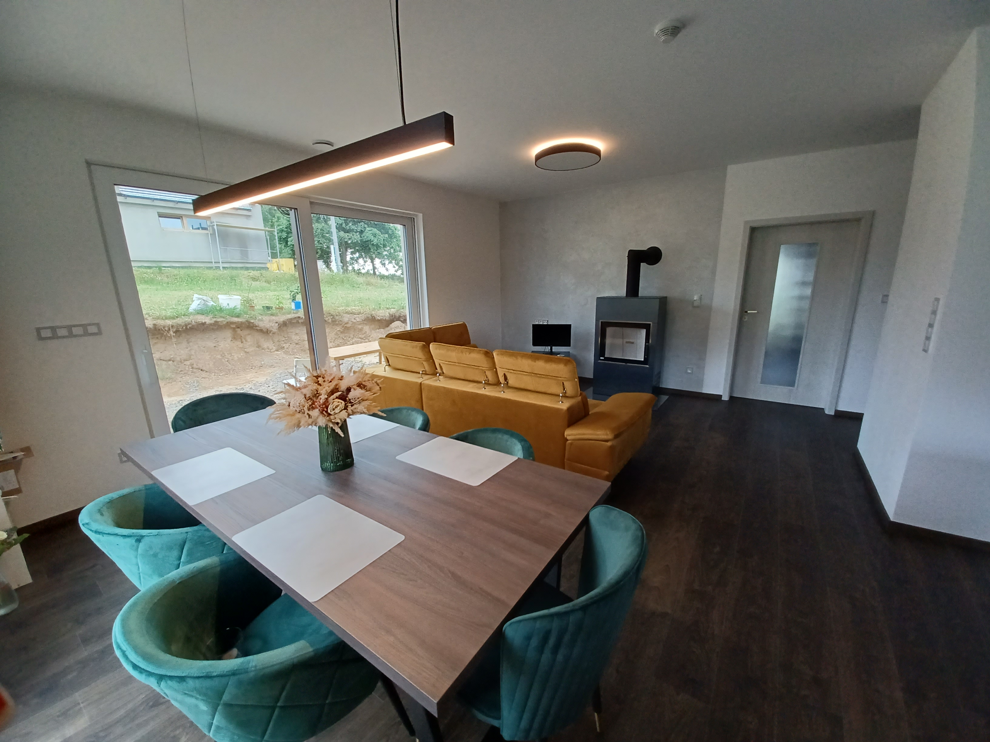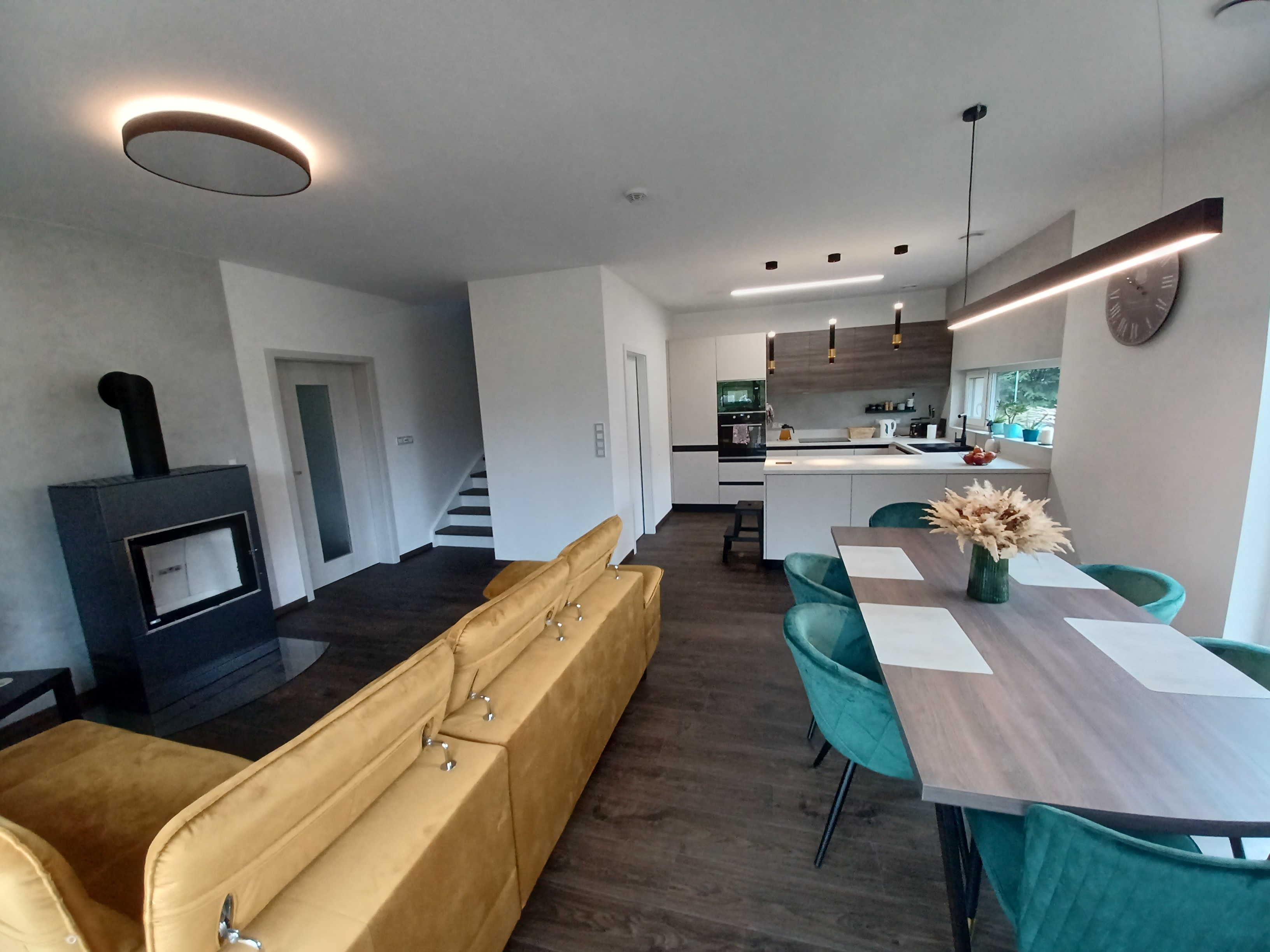 Rodinný dům v Bohdalicích zdobí příjemná dřevěná svítidla, která v interiéru vytváří hřejivou a přirozenou atmosféru. Celkový dojem doplňuje promyšlené ambientní osvětlení, složené z LED pásků, nepřímých nástěnných a orientačních svítidel.