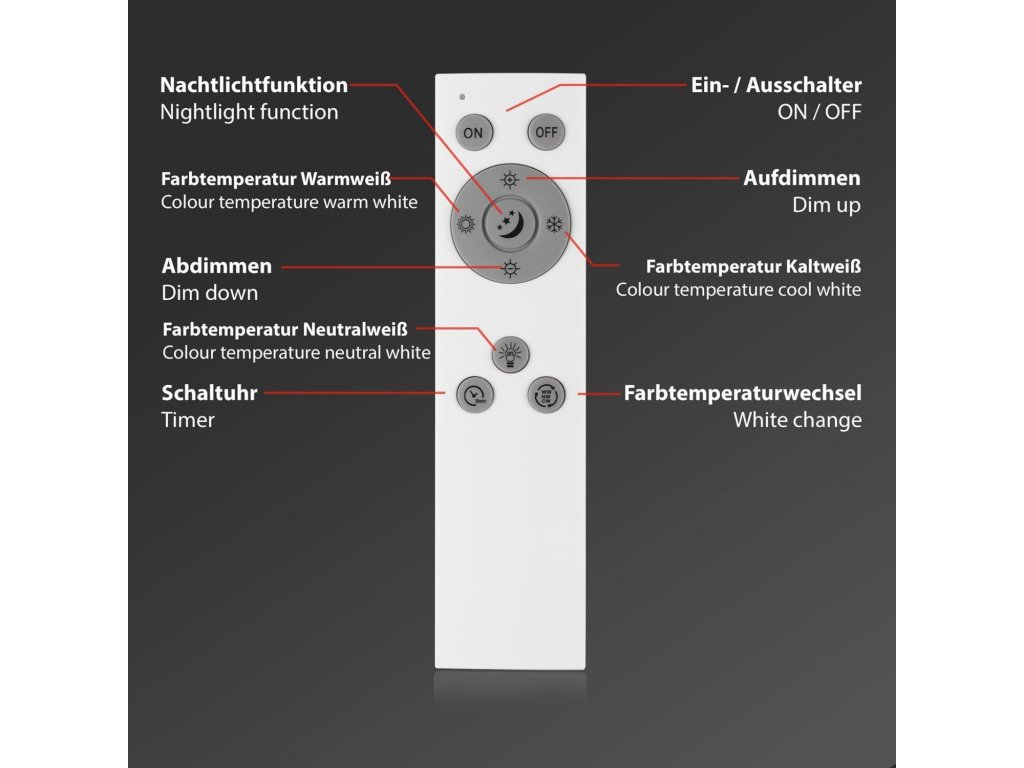 Ploché LED stropní svítidlo je ideálním doplňkem do každého interiéru, díky svému jednoduchému designu. Svítidlo je nabízené v černé nebo bílé barvě. Integrovaný LED modul vydává příjemné neoslňující světlo. Nastavení teploty barev se provádí pomocí dálkového ovladače. Dálkovým ovladačem lze ovládat jednotlivá světla a skupiny světel. Můžete také měnit jejich jas a barvu a ukládat je pomocí funkce paměti. Svítidlo je ultraploché, jeho výška je pouze 3 cm. Svítidlo je vhodné jako světlení obývacího pokoje, dětského pokoje, nebo také hotelového pokoje.