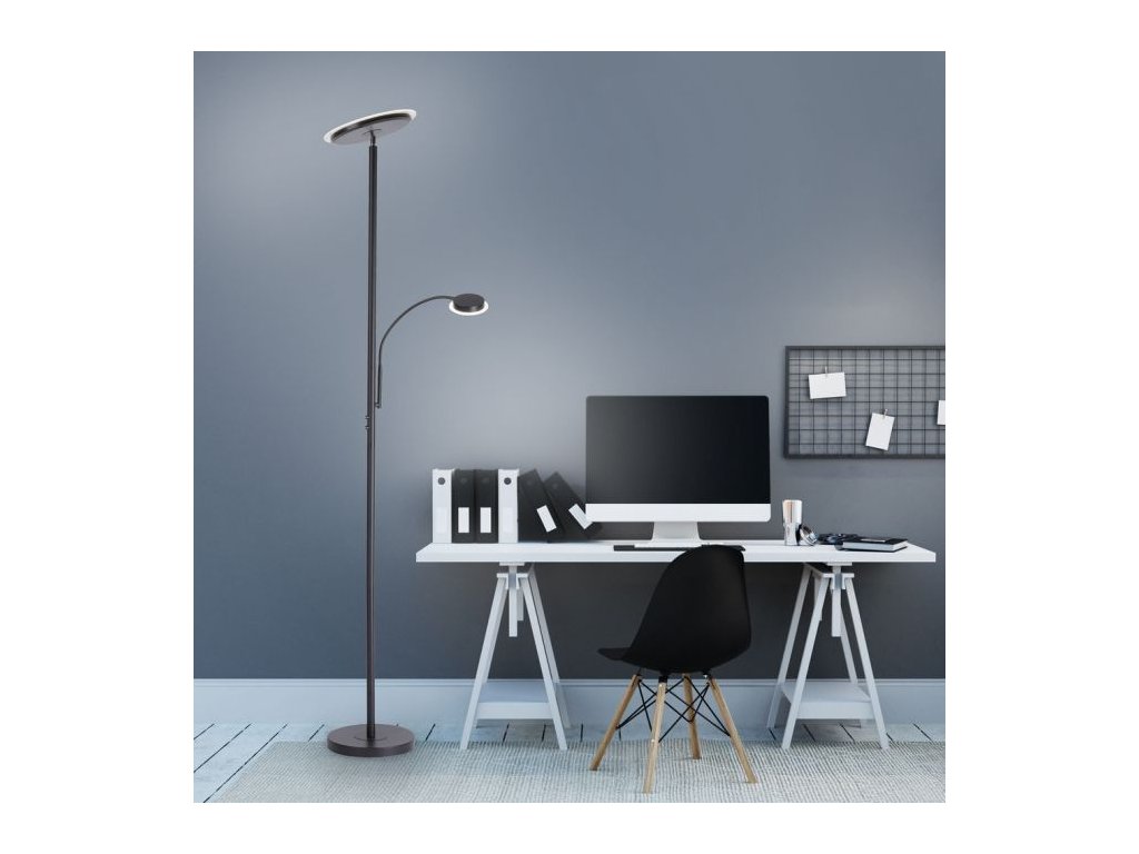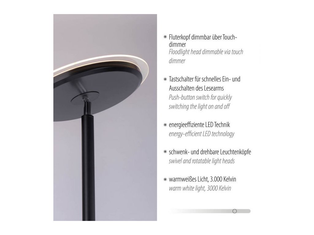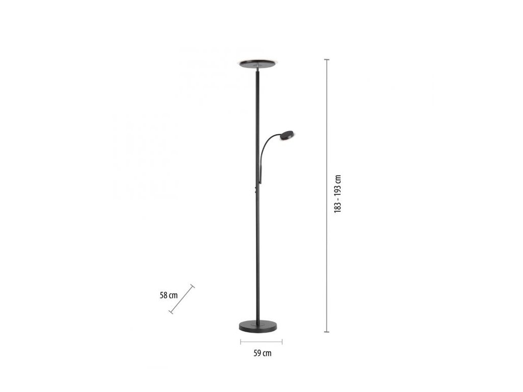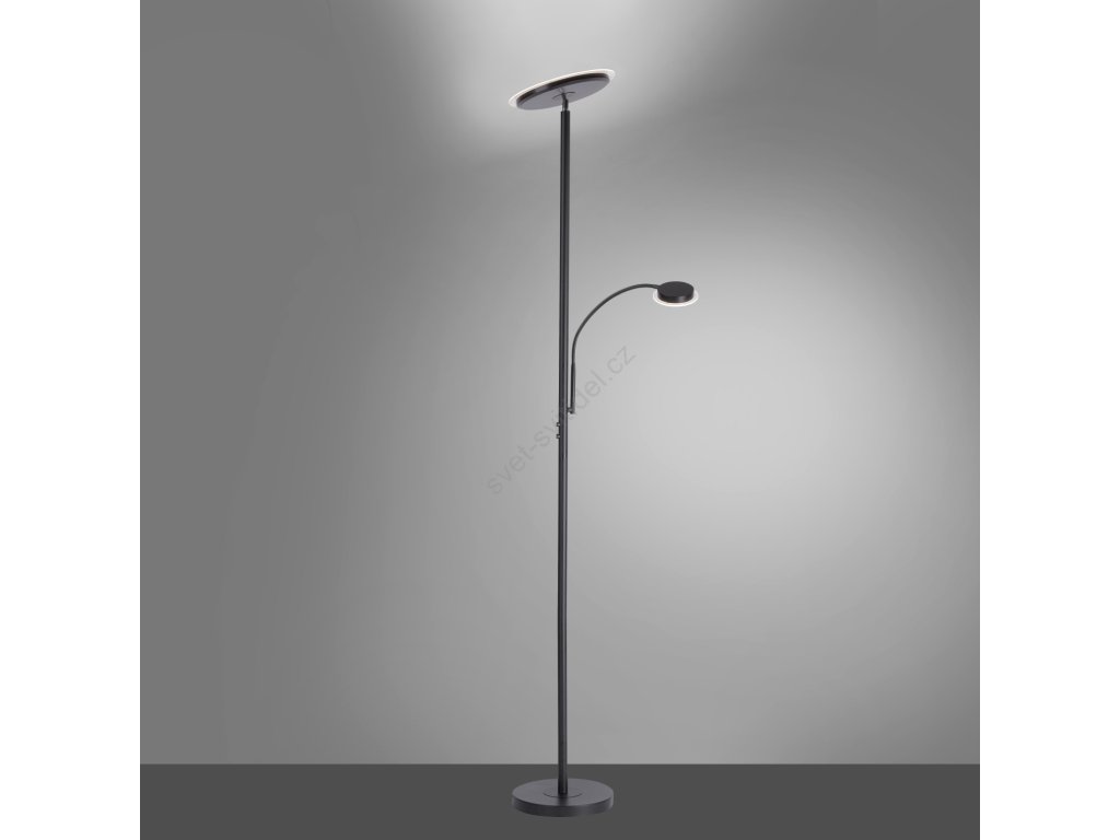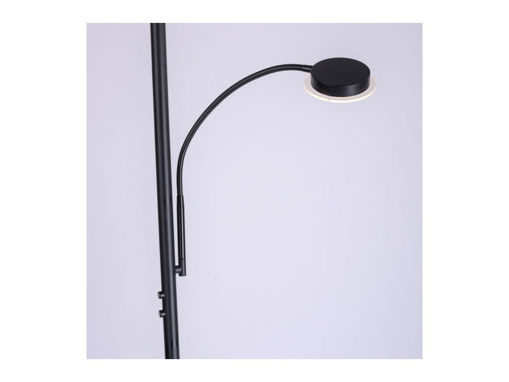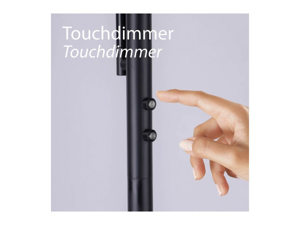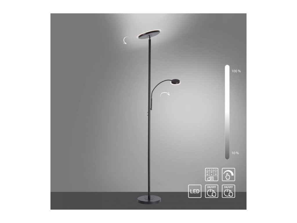 Černý svítidlo HANS zaujme svým futuristickým designem. Oba světelné zdroje lze ovládat samostatně. Kulatou hlavu svítidla lze plynule stmívat pomocí dotykového stmívače. Čtecí lampa stojací lampy je však pouze spínatelná. Flexibilní čtecí rameno je otočné a lze jej nastavit podle libosti. Jak v reflektoru, tak v lampičce na čtení je integrovaný LED zdroj, která svítí teplou bílou barvou o teplotě 3000 kelvinů. Moderní stojací lampa se hodí zejména jako doplňkové osvětlení v obývacích pokojích a ložnicích.