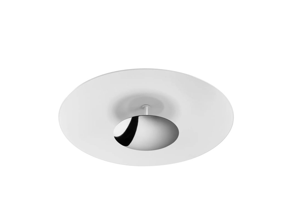 Designové LED stropní svítidlo Horizon_S. Létající disk odrážející a rozptylující světlo; bílý difuzér rozptyluje nepřímé osvětlení na pracovní desku, aniž by docházelo k úniku světla. Scénograficky působivé závěsné nebo stropní svítidlo. Materiály: bílý nebo černý povrch s vrásčitým povrchem, difuzér s pískovaným nebo sítotiskovým povrchem.