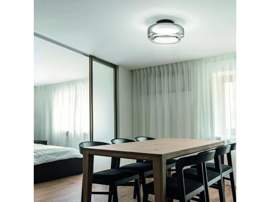 Kovový rám s matným lakem. Dvojitý skleněný difuzér: zevnitř leptaný na bílo, zvenku čirý s kouřovým odstínem v horní části.