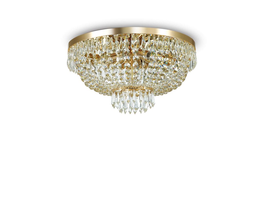 Závěsné svítidlo Caesar z kolekce designového osvětlení značky Ideal Lux v klasickém provedení ve větší verzi s průměrem 51 cm je ideální volbou pro osvícení obývacího pokoje, jídelny či kuchyně. Díky svému luxusním designu skvěle zapadne do holetových a restauračních interiérů. Celé svítidlo je zdobeno čirými skleněnými závěsy s osmihranými křišťály a přívěsky ve tvaru rampouchů. Jeho rám je zhotoven z kvalitního kovu se zlatou povrchovou úpravou. Je osazeno paticemi G9 pro žárovky o maximálním příkonu 6 x 40 W. Součástí balení jsou LED G9 žárovky o příkonu 6 x 3 W se svítivostí 6 x 370 lm a teplotou chromatičnosti 3000 K. Krytí IP20 je vhodné pro vnitřní instalaci. Celkové rozměry svítidla činí 30 x 51 x 51 cm. Svítidlo je určeno k napájení ze sítě na 220-240 V.Doplňkové parametry