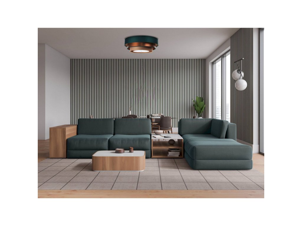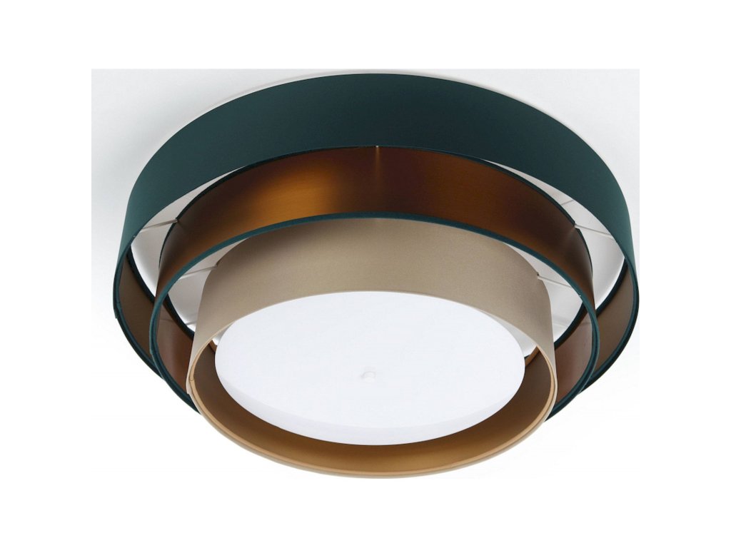 Stropní svítidlo TRINITY v tmavě zelené barvě v kombinaci s bronzovou a krémovou barvou. Stínidlo je odolné vůči UV záření, takže tkanina během používání nevybledne. Průměr svítidla činí 60 cm. Skvěle se hodí do obývacího pokoje či ložnice.