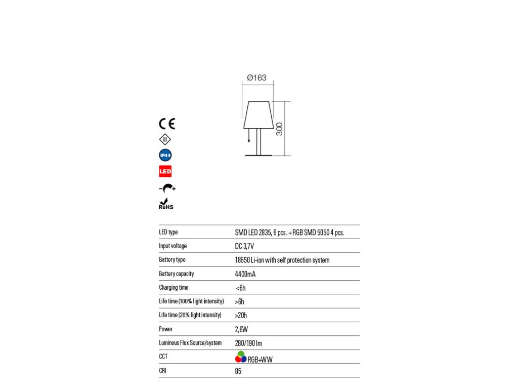 Venkovní stolní lampa vybavená SMD LED diodami v barvě světla teplé bílé a RGB LED, ve standardu ON/OFF, stmívatelné. Svítilna je také vybavena micro USB zásuvkou a nabíječkou 110-240V. Hliníková konstrukce lakovaná, polyethylenový difuzér. Doba nabíjení 6 hodin, po nabití baterky funguje 6 hodin.Parametry produktu: