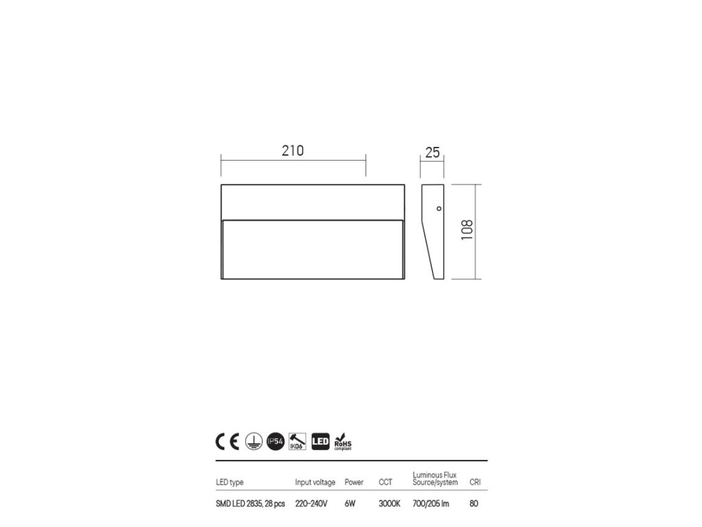 Venkovní nástěnné svítidlo vybavené SMD LED diodami, tělo z tlakově litého hliníku elektrostaticky lakované matnou bílou nebo antracitovou barvou, čirý polykarbonátový difuzor.