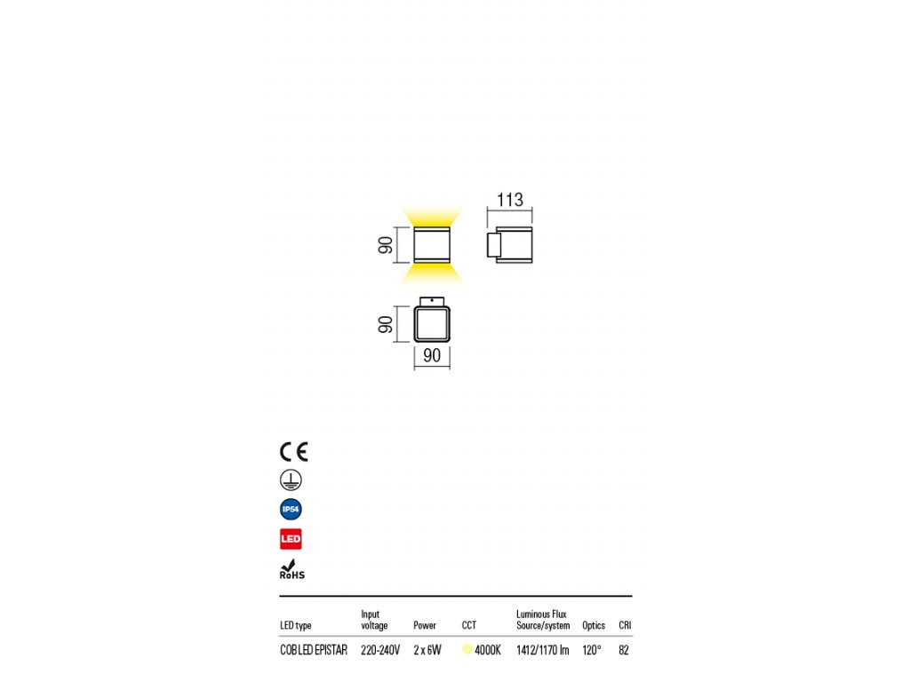 Nástěnné venkovní svítidlo vybavené COB LED diodami s přímými / nepřímými vyzařováním světla. Hliníková konstrukce lakovaná tmavě šedým, průhledným difuzorem z tvrzeného skla.Parametry produktu: