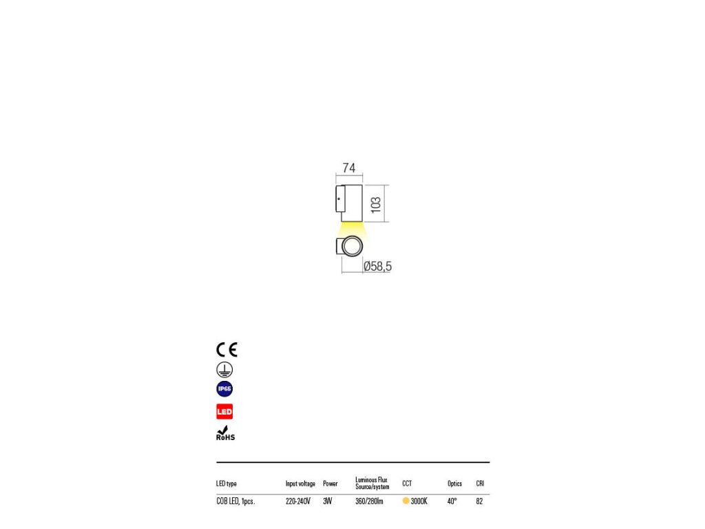 Venkovní nástěnné svítidlo vybaveno LED diodami COB s hliníkovou konstrukcí. Osvětlení svítí směrem dolů na stěnu, stane se tak krásnou venkovní dekorací.Parametry produktu: