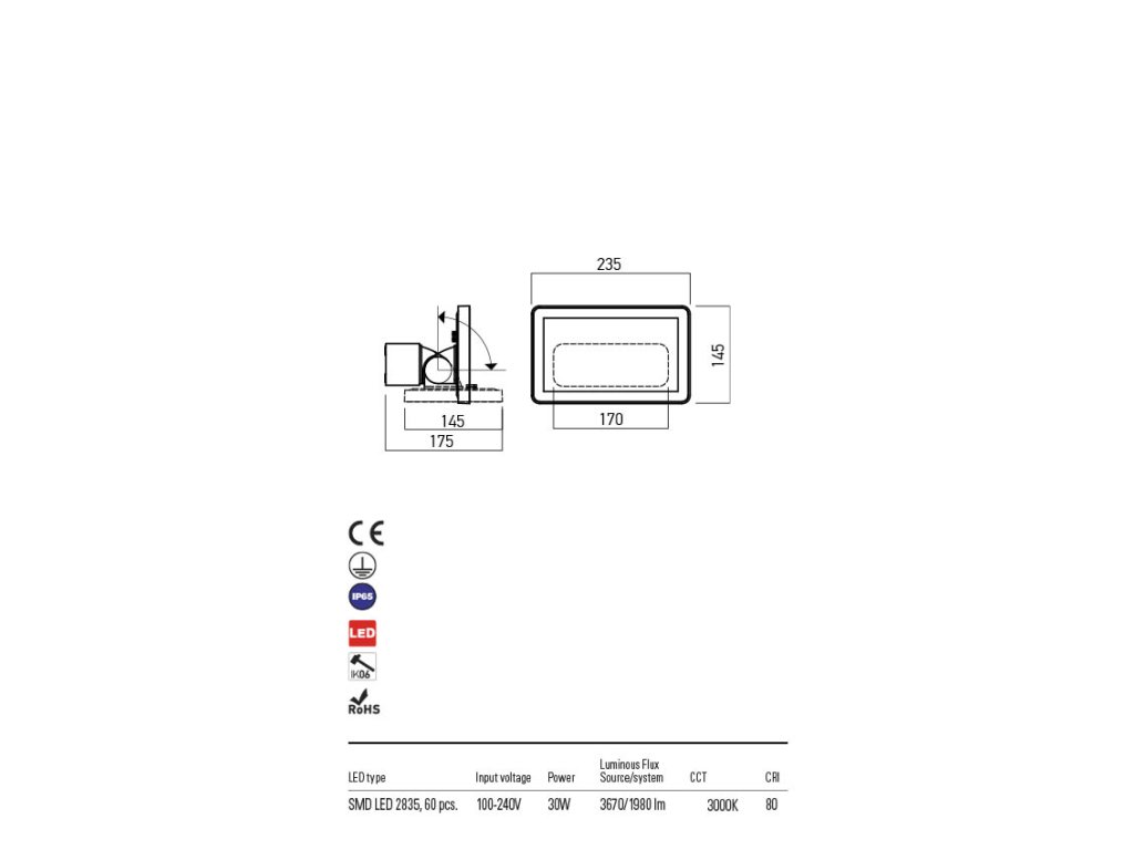 Venkovní nástěnné LED svítidlo (reflektor) FLUX s výklopnou hlavou. Svítidlo má tělo z hliníkového odlitku lakované v tmavě šedé barvě a difuzor z tvrzeného skla s bílým sítotiskem, pod kterými je zabudován LED zdroj s barvou světla 3000K. Exteriérové venkovní svítidlo Flux má ochranné krytí IP65, napájení 220-240V, CRI80.Parametry produktu: