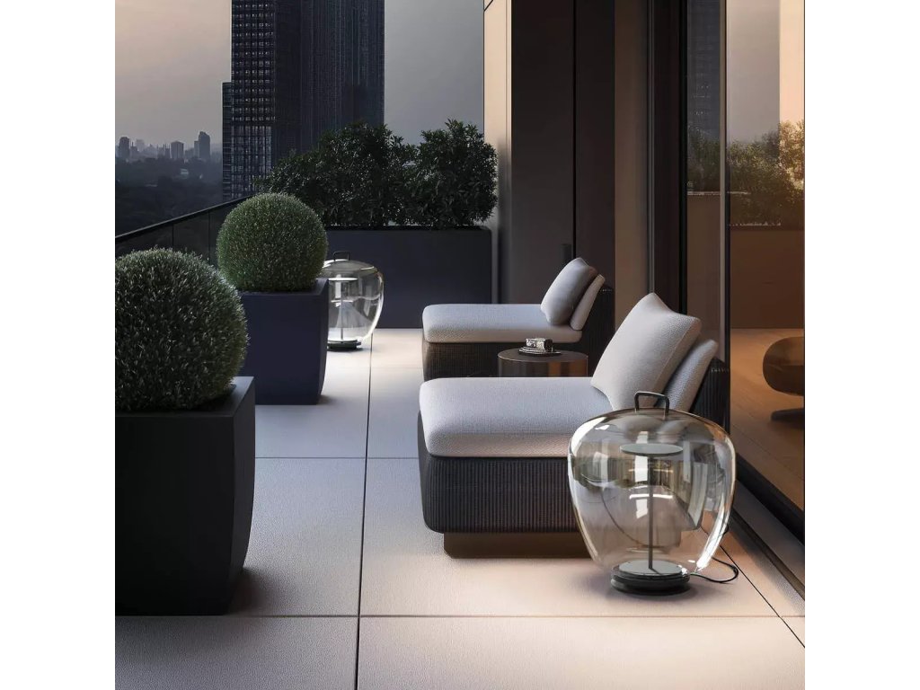 Lucerna Rolling Sky Lantern vyniká svým amforovitým tvarem a je vyrobena z průhledného polymethylmetakrylátu (PMMA) – materiálu známého svou vysokou odolností a schopností rovnoměrně a jemně rozptylovat světlo. Světelný zdroj je chráněn kruhovou deskou, která odráží a rozptyluje světlo směrem dolů a vytváří tak teplou a příjemnou záři, ideální pro zahrady, terasy, patio nebo verandy.