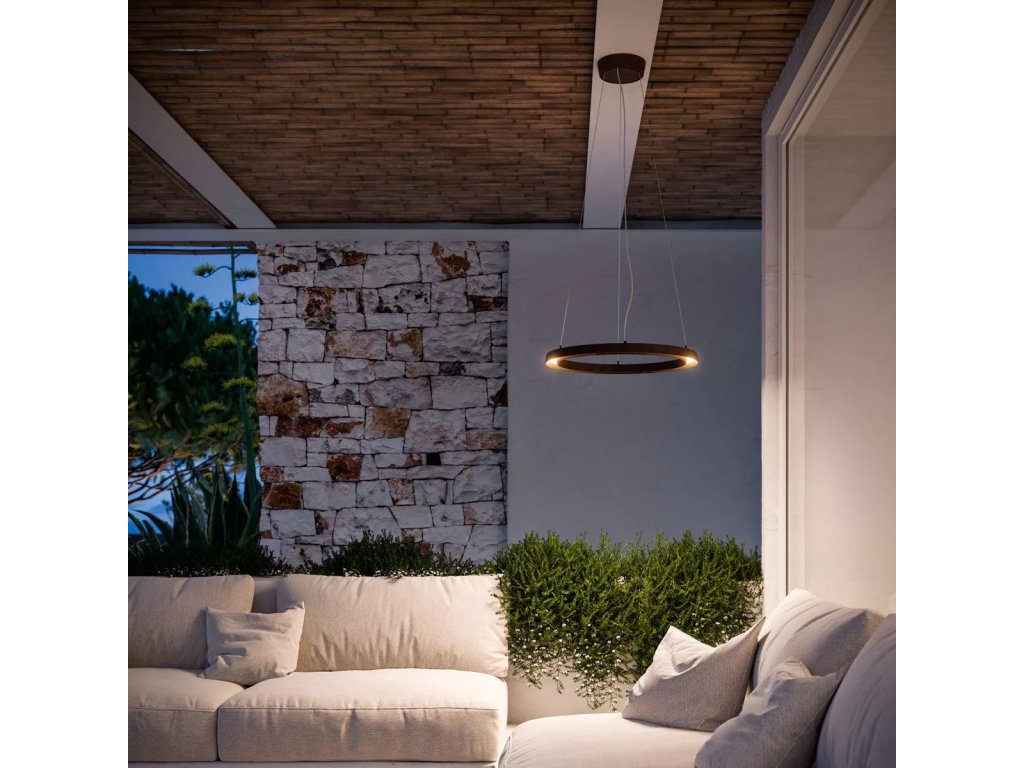LED závěsné svítidlo kruhového tvaru s lakovaným hliníkovým tělem a bílým difuzorem z polyuretanové pryskyřice. Svítidlo Lira_PR je díky vysokému stupni ochrany proti prachu a vodním proudům vhodné pro venkovní použití. Tento produkt je k dispozici ve dvou provedeních – černém nebo tmavě hnědém – oba navržené tak, aby ladily s vnějším prostředím.